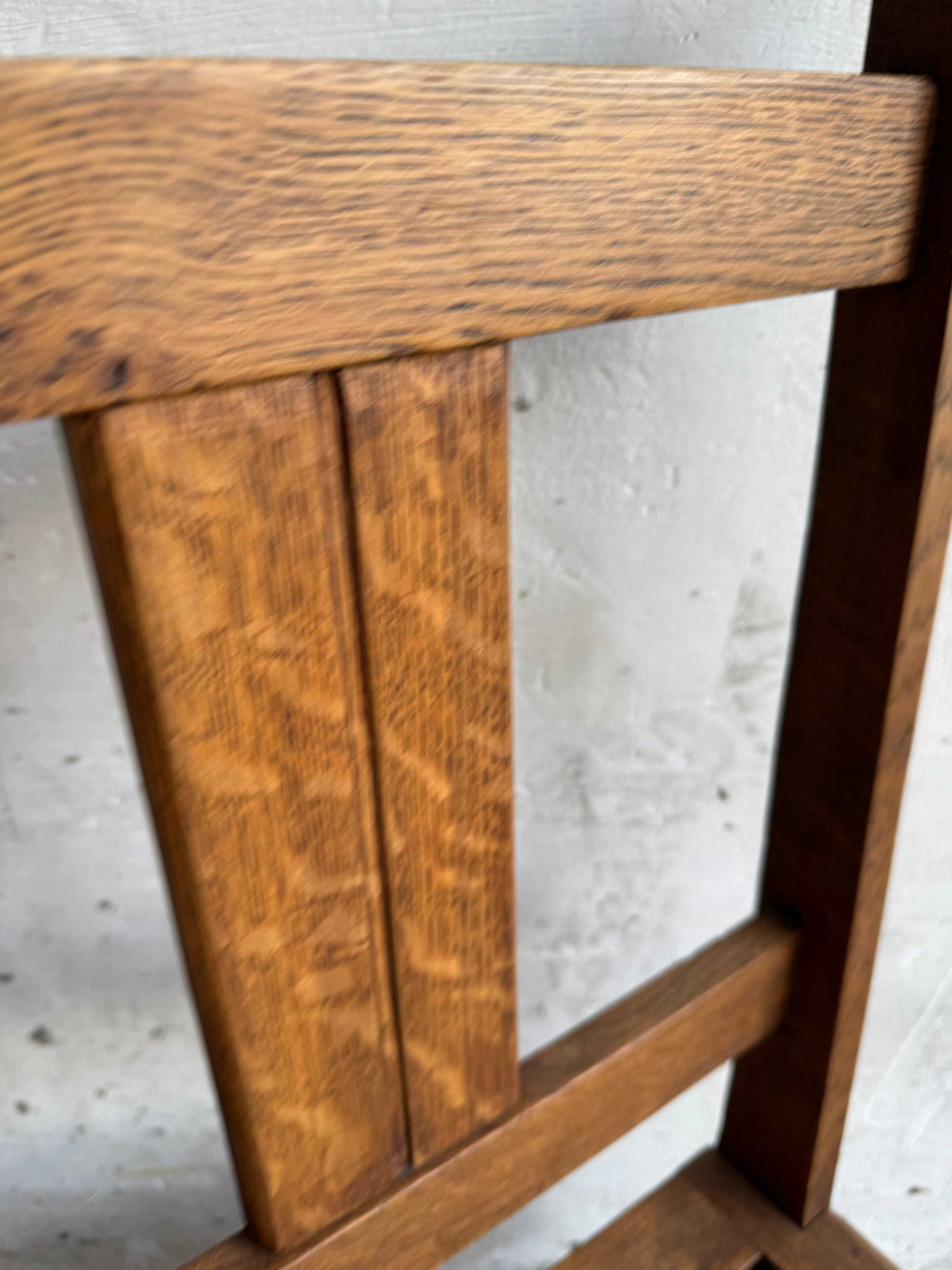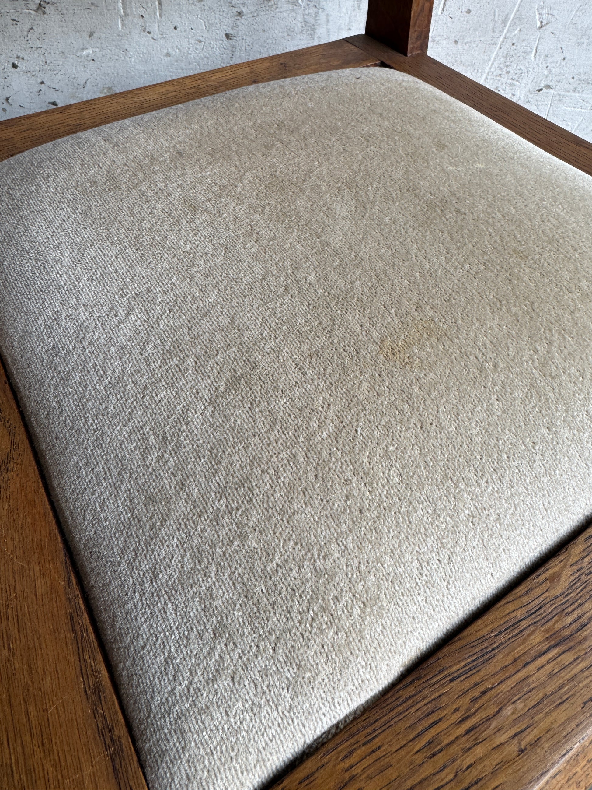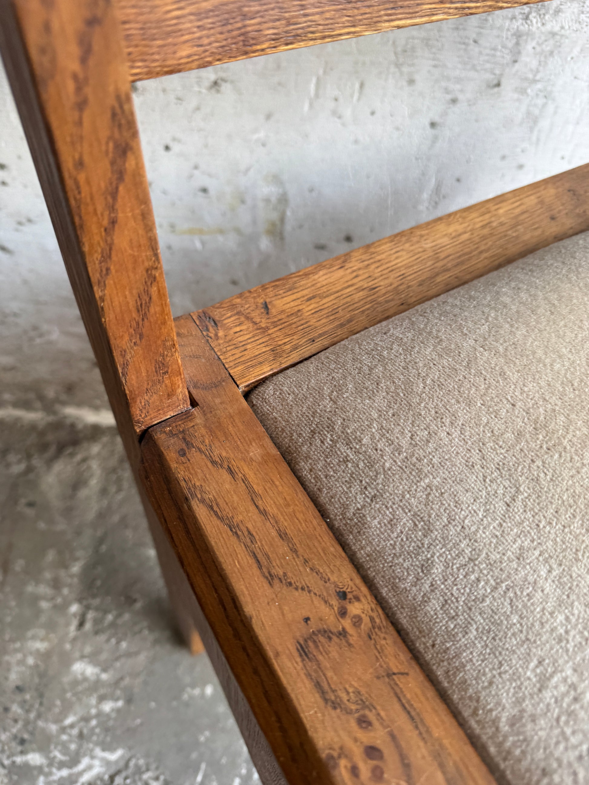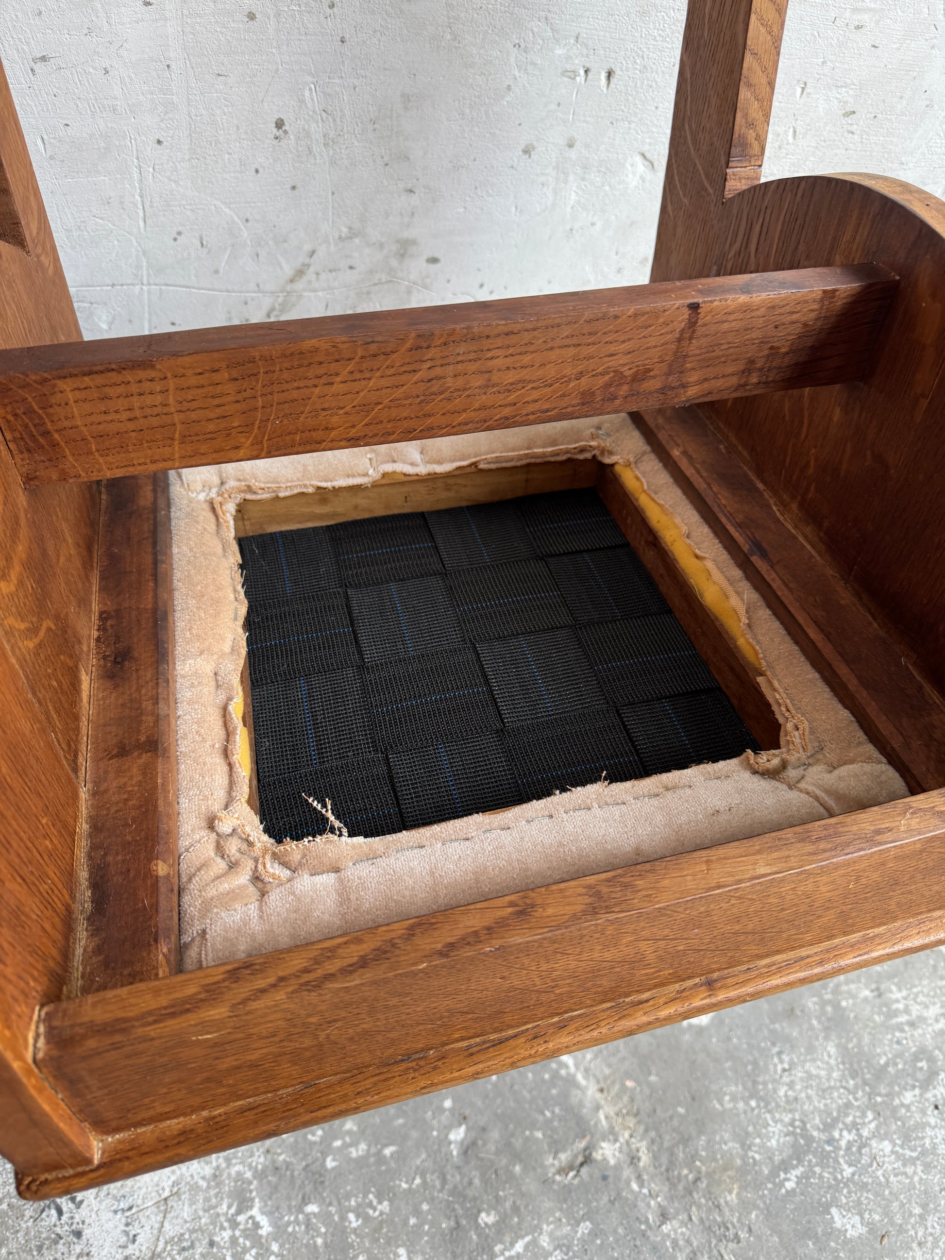 The chairs feature tall, straight backs with clean vertical lines, solid oak frames, and upholstered seats for comfort. Their timeless design combines robust craftsmanship with refined detailing, making them an authentic example of early 20th-century Dutch Art Deco furniture. Comparable to works by designers such as J.J. Zijfers or Fa. Drilling.