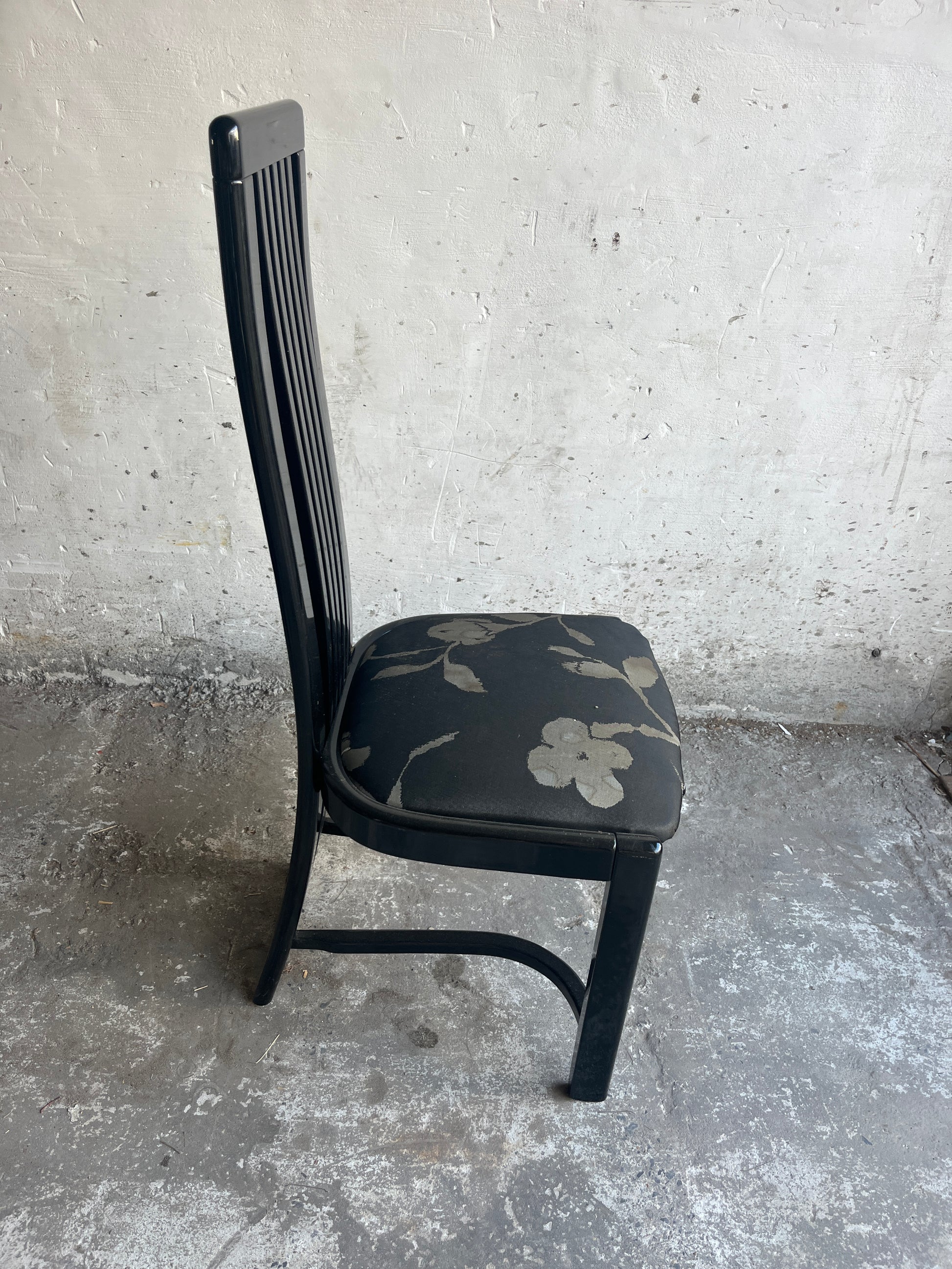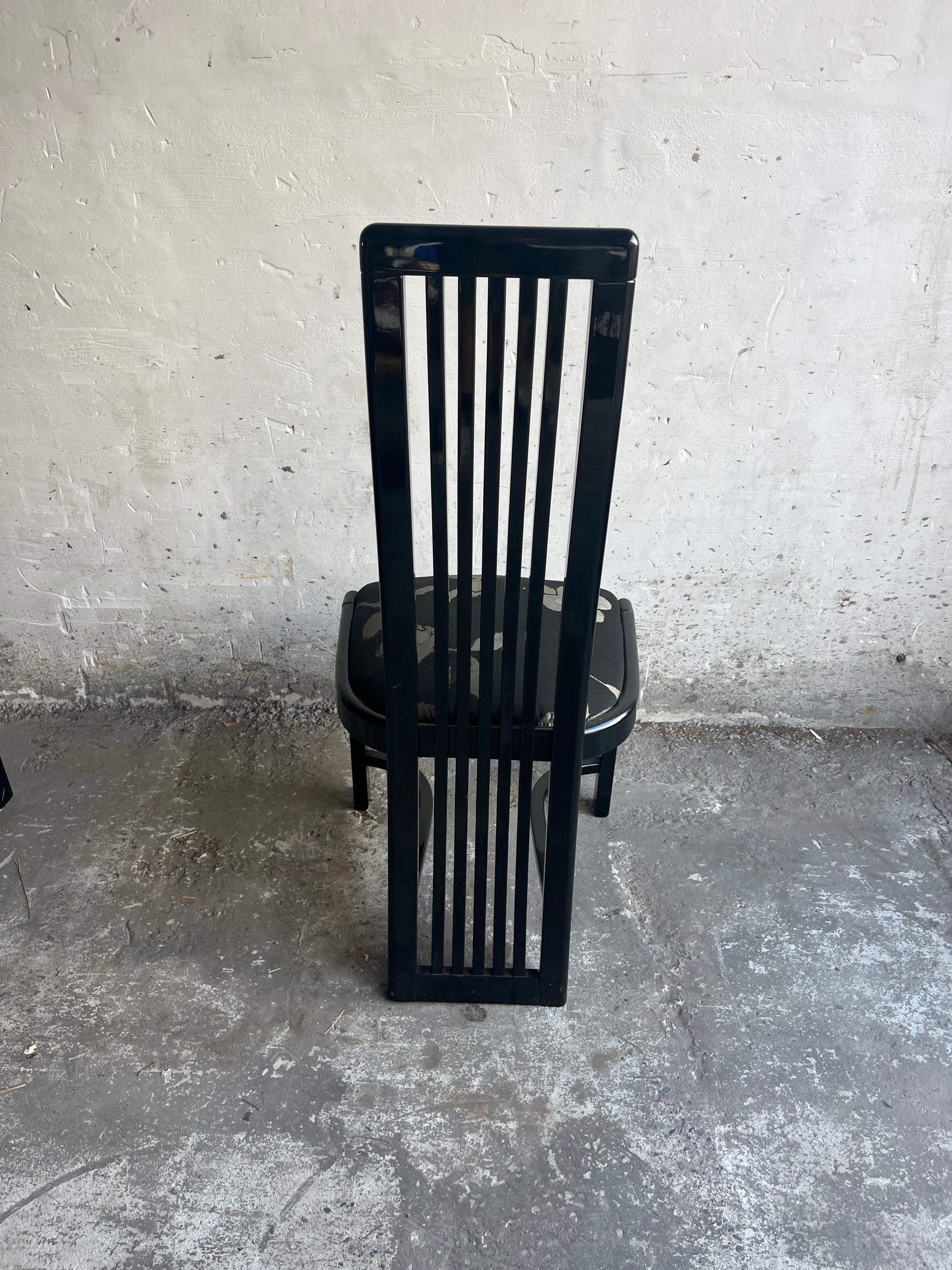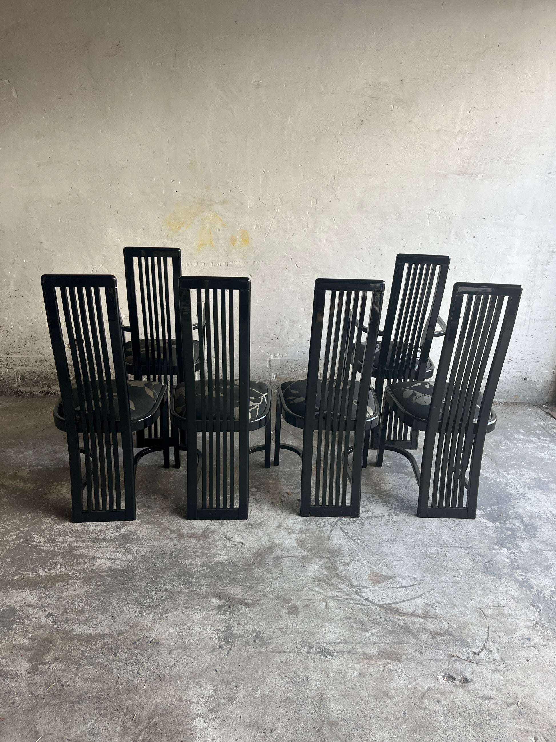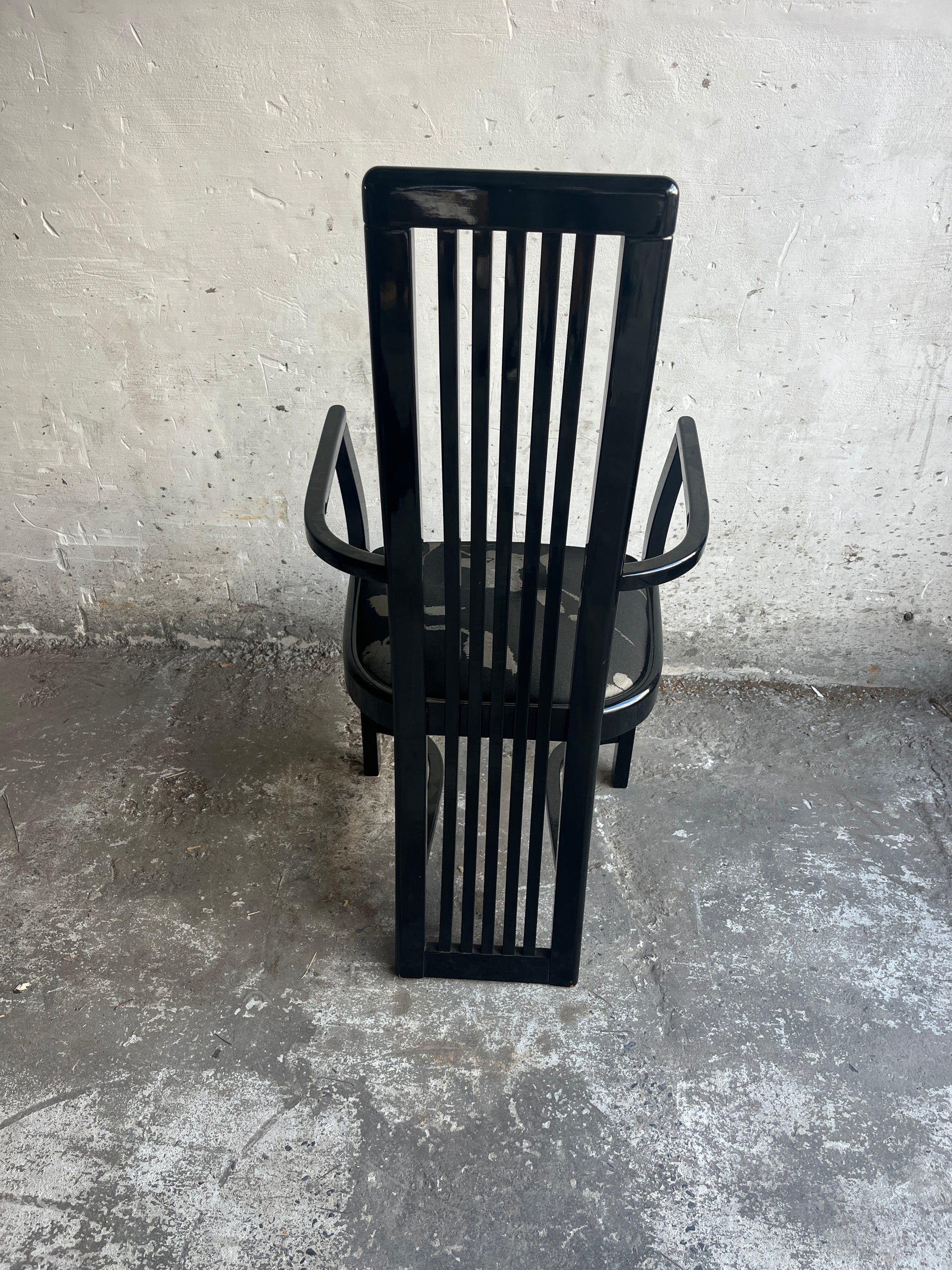Elegant set of six dining chairs with striking high-back slatted design, dating from the 1980s. The set includes two armchairs and four side chairs. Their bold geometric lines and glossy black lacquered finish give them a strong postmodern appeal.