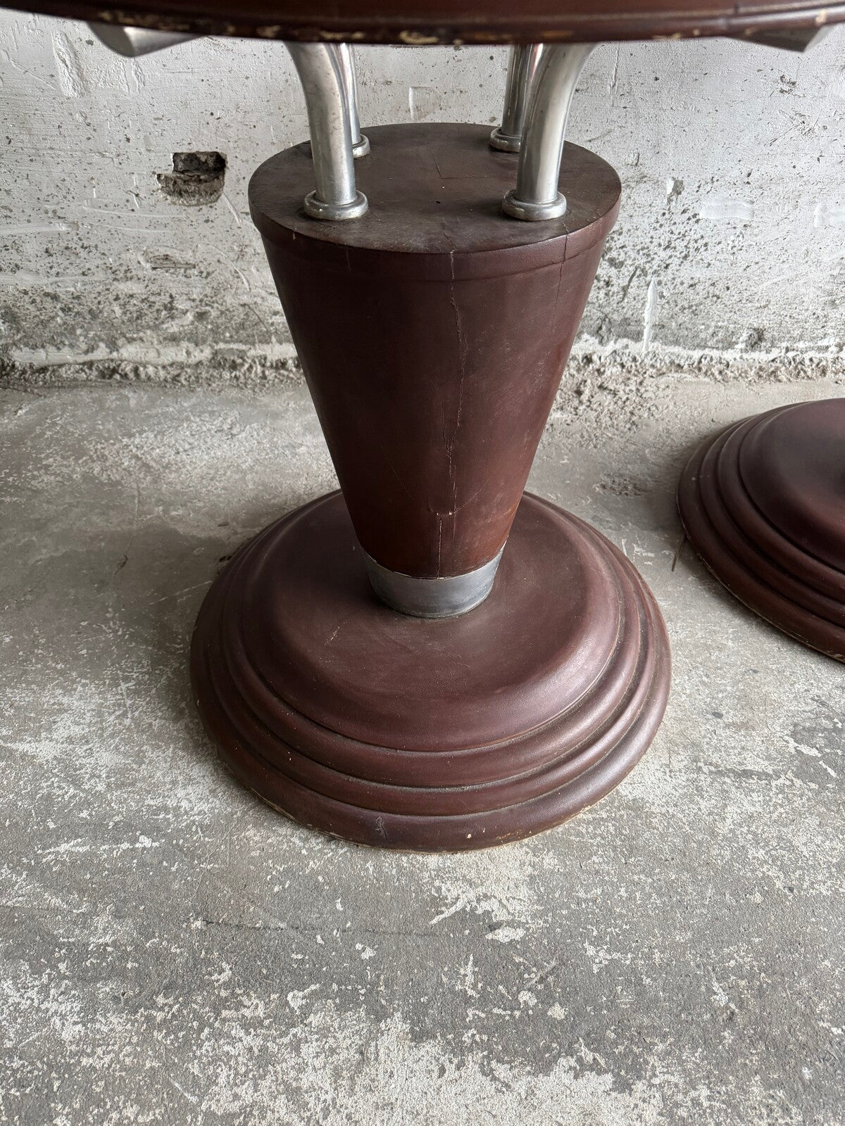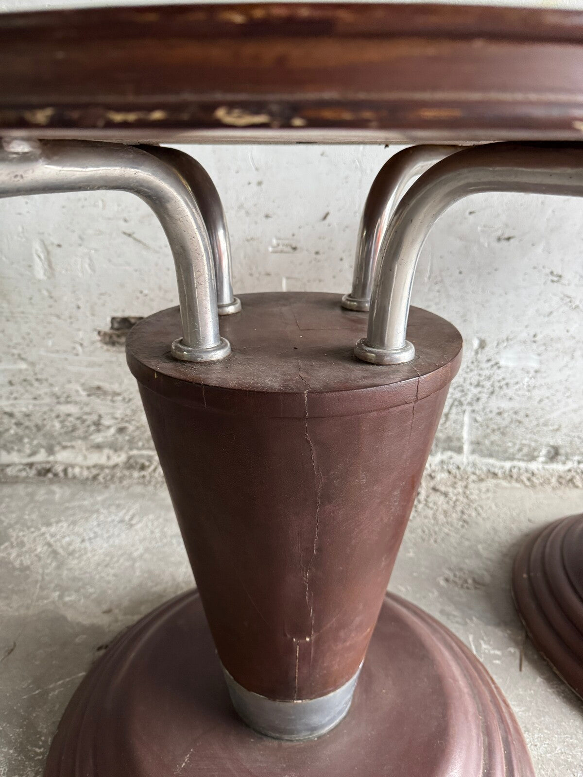 Set van 2 Art Nouveau bijzettafels met gevlochten blad Deze elegante set tafels uit het begin van de 20e eeuw is een prachtig voorbeeld van Art Nouveau design. De combinatie van het ronde blad met gevlochten rotan en het sculpturale onderstel van gelaagd hout geeft deze tafels een unieke, organische uitstraling.