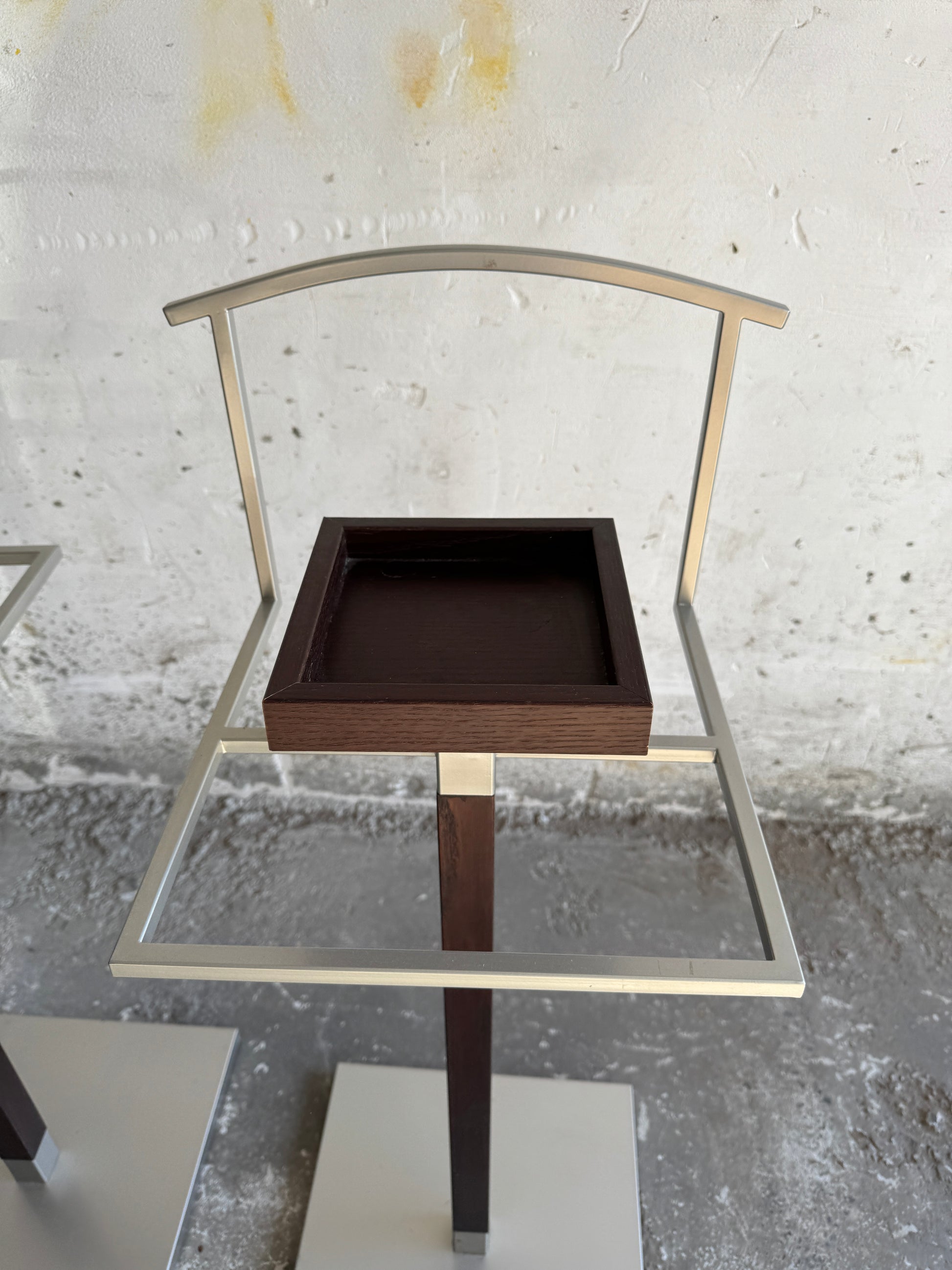 De hoge houder met gebogen rugsteun als kostuum- van kledinghouder, terwijl het lagere model dient als parapluhouder. De open metalen structuren zorgen voor een luchtige look, terwijl de houten details warmte toevoegen.