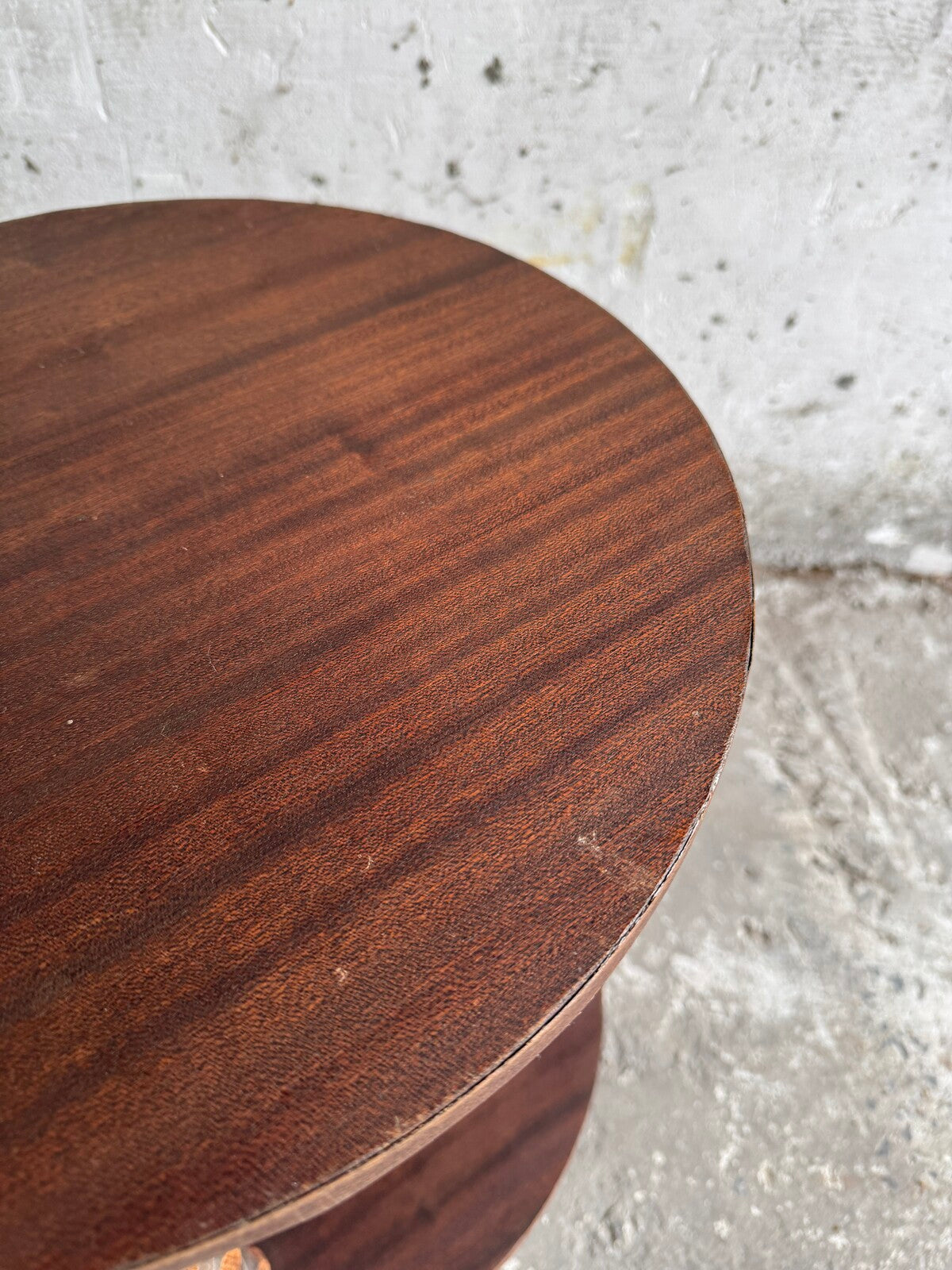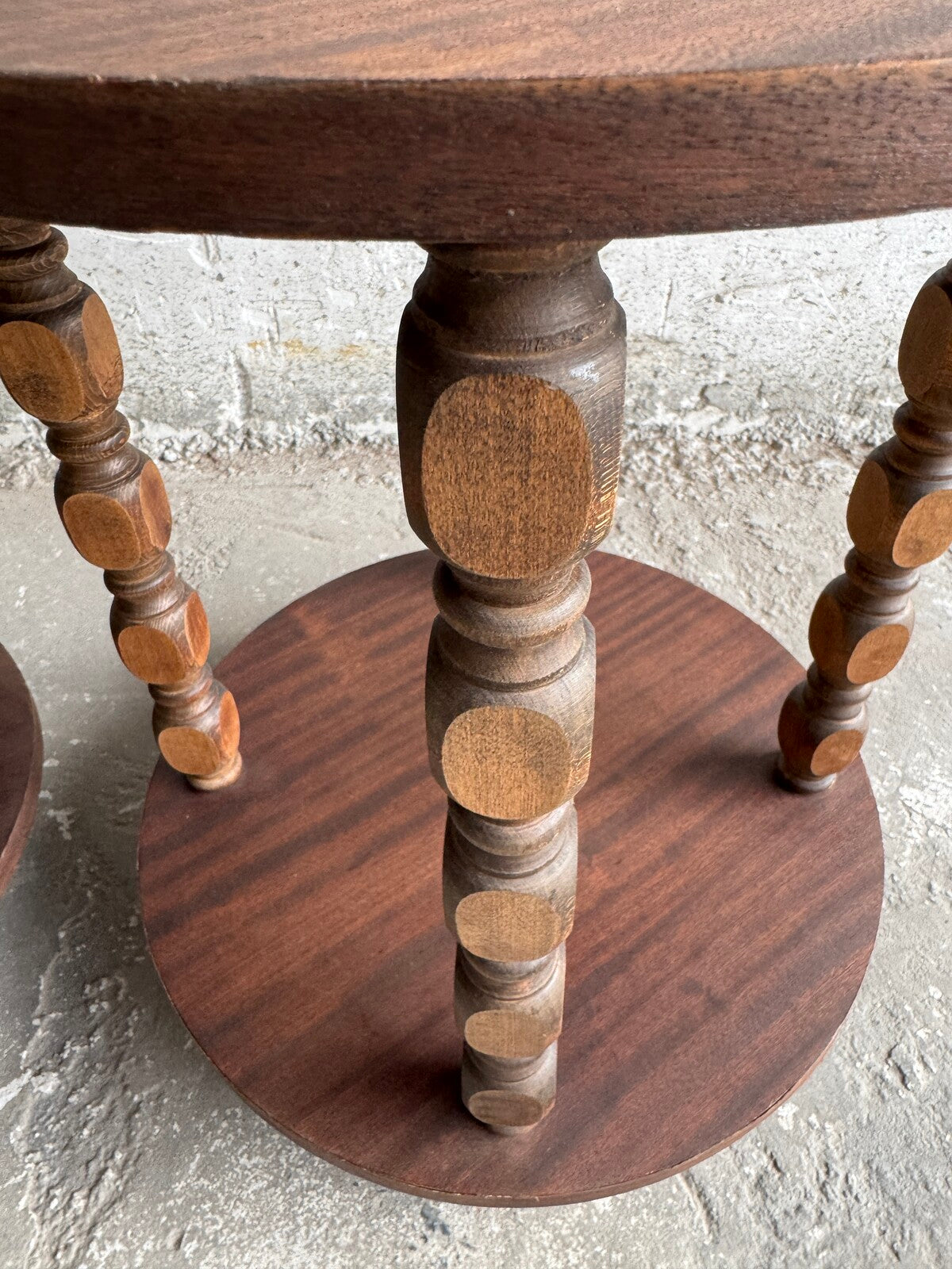 Set van 2 houten brutalistische bijzettafels Deze compacte tafeltjes combineren een rond blad met robuuste, gedraaide poten in een kenmerkende brutalistische stijl. De donkere houttint en stevige constructie geven de set een gedurfd, architectonisch karakter.