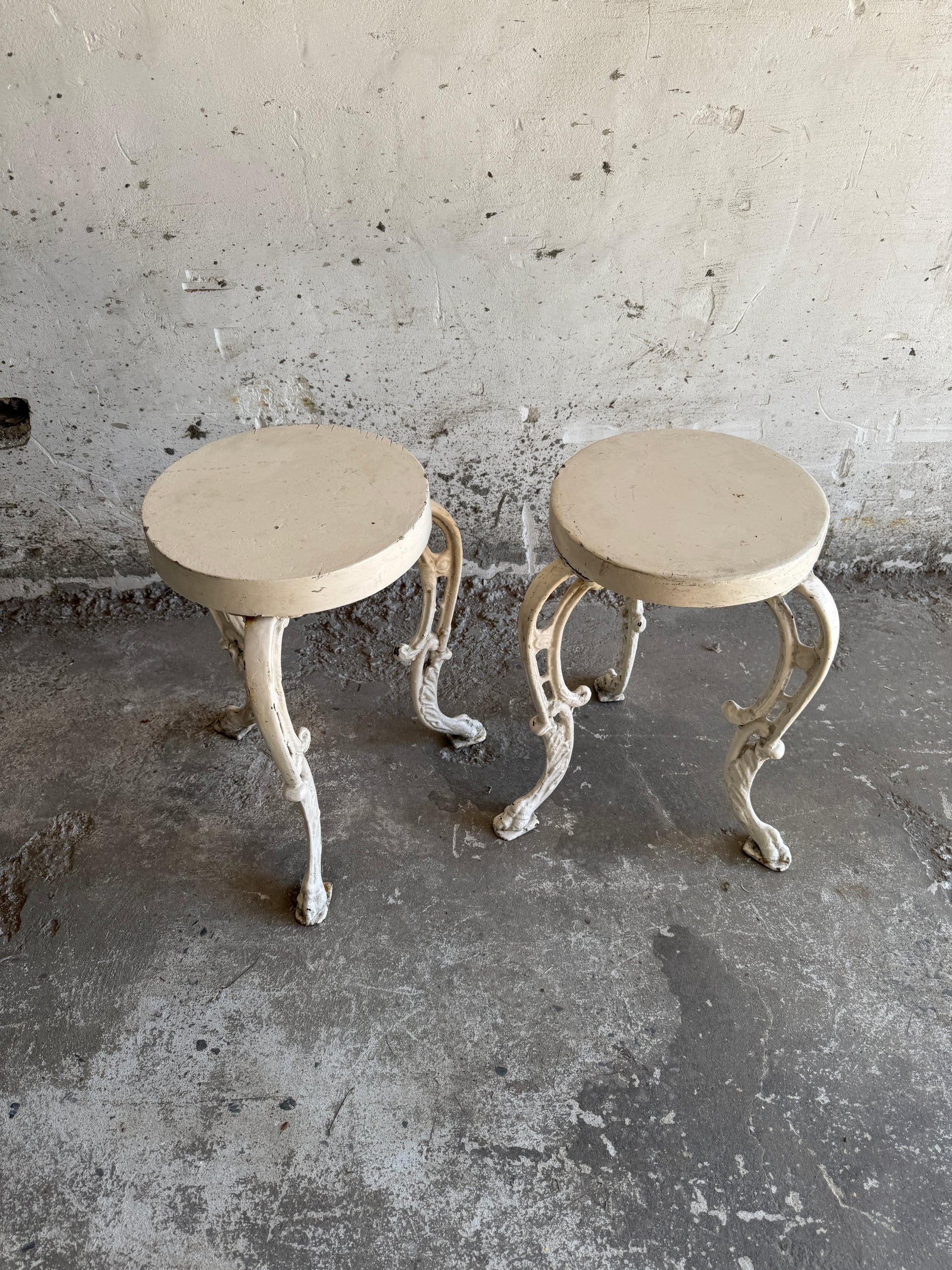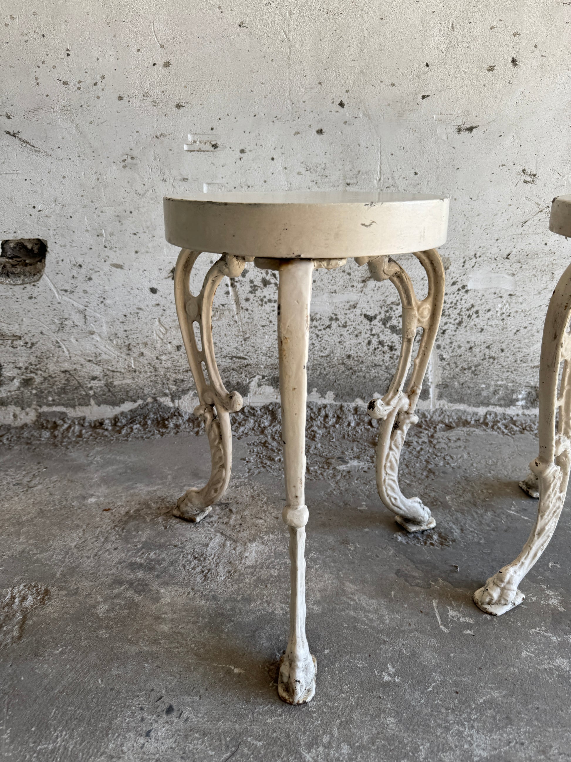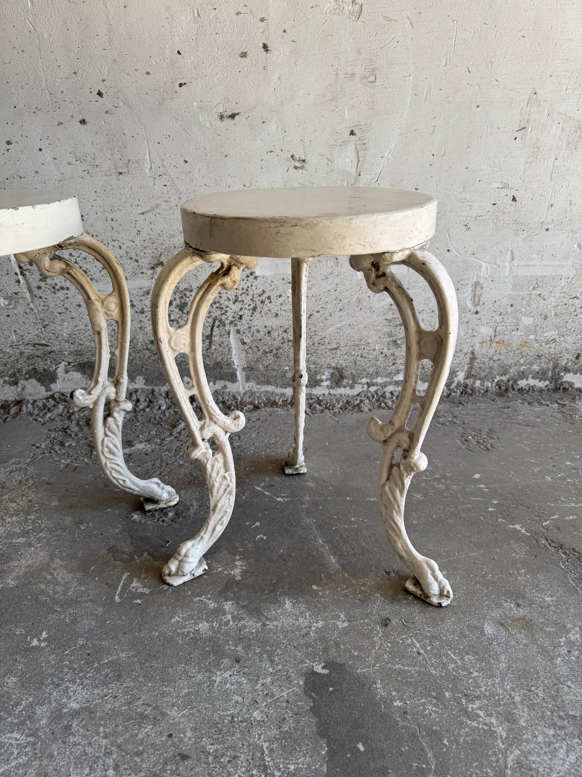 Set van twee antieke gietijzeren bijzettafels Deze elegante tafels combineren een rond houten blad met sierlijk gevormde gietijzeren poten in witte patina. De gebogen lijnen en klauwvormige poten geven ze een kenmerkende neoklassieke uitstraling.