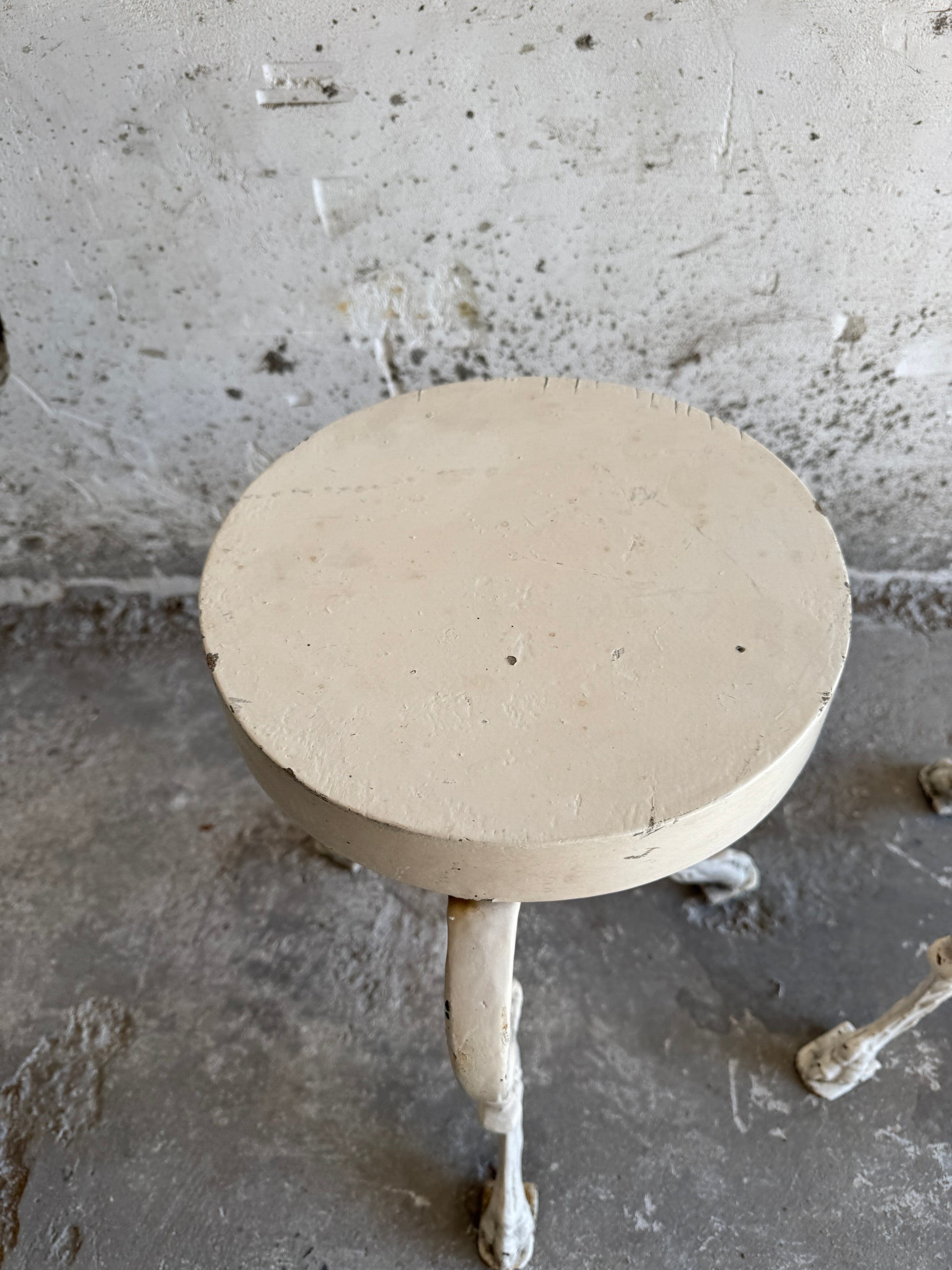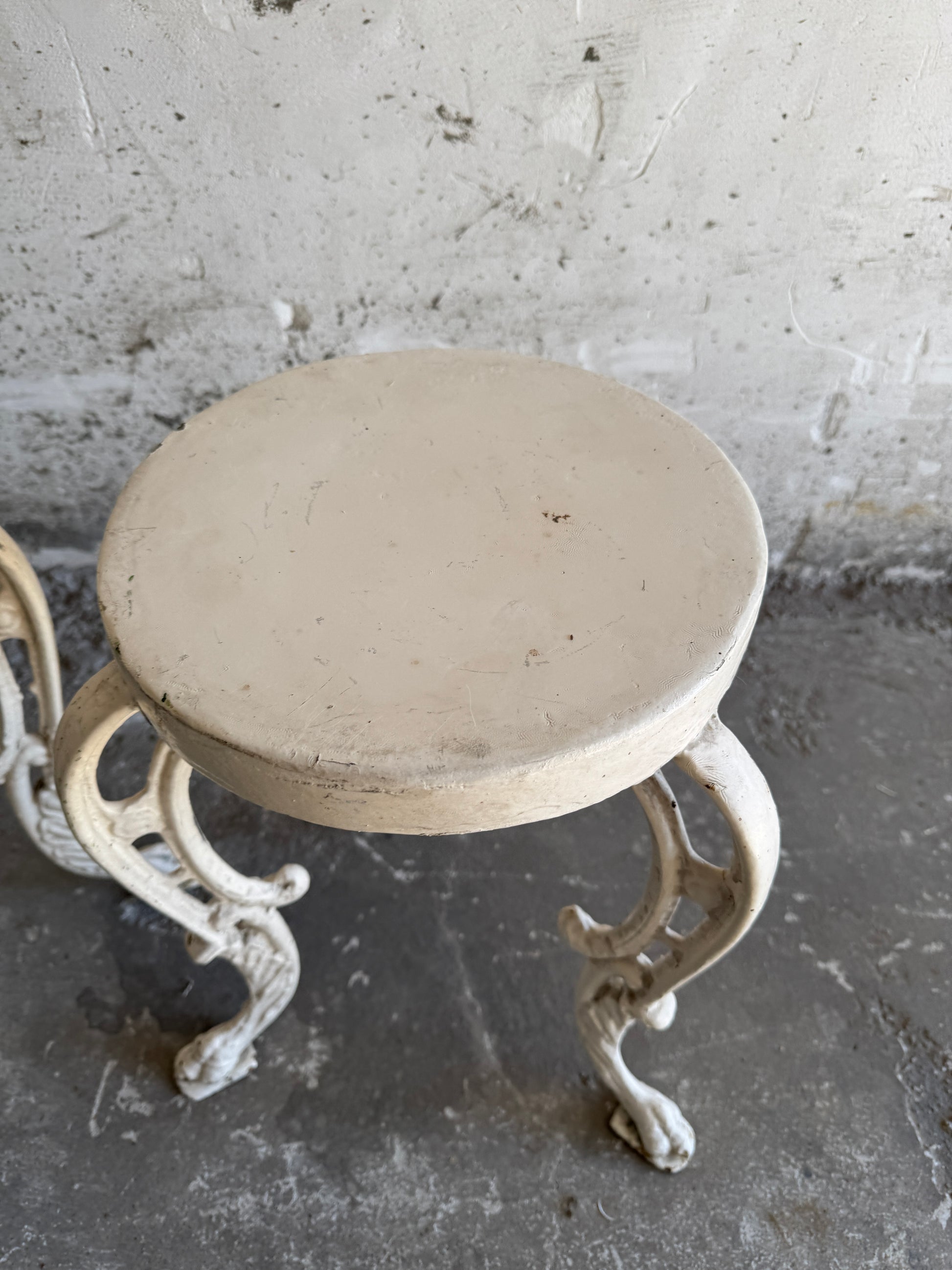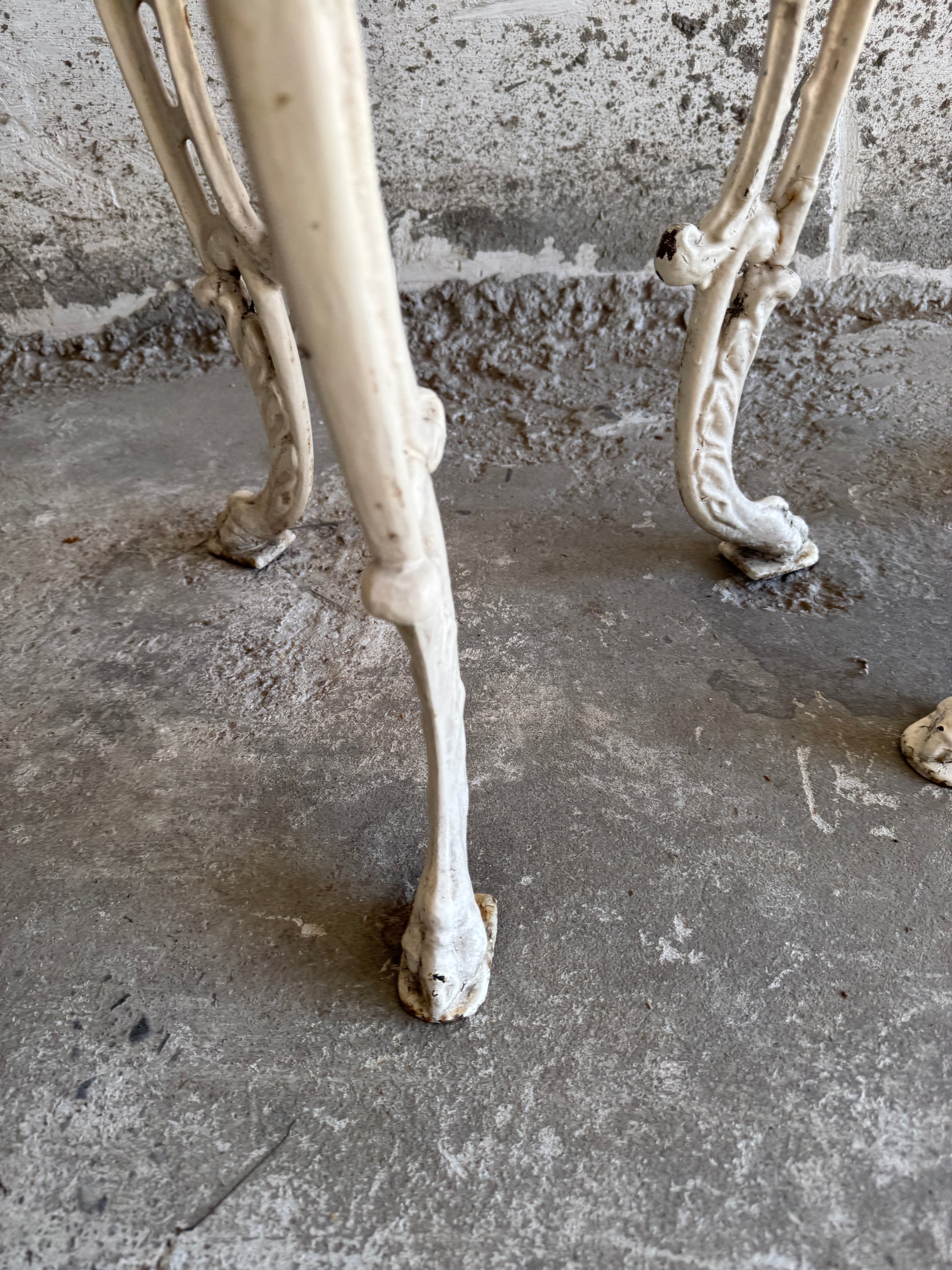 Set van twee antieke gietijzeren bijzettafels Deze elegante tafels combineren een rond houten blad met sierlijk gevormde gietijzeren poten in witte patina. De gebogen lijnen en klauwvormige poten geven ze een kenmerkende neoklassieke uitstraling.