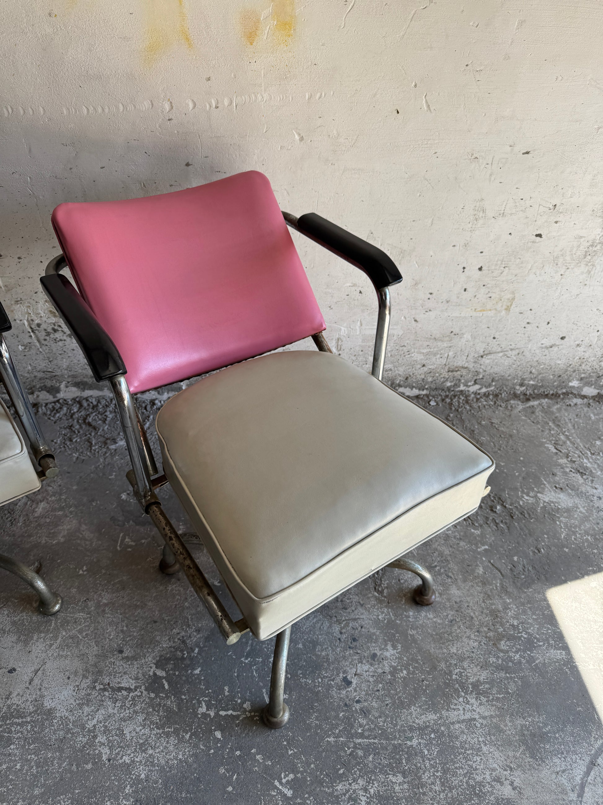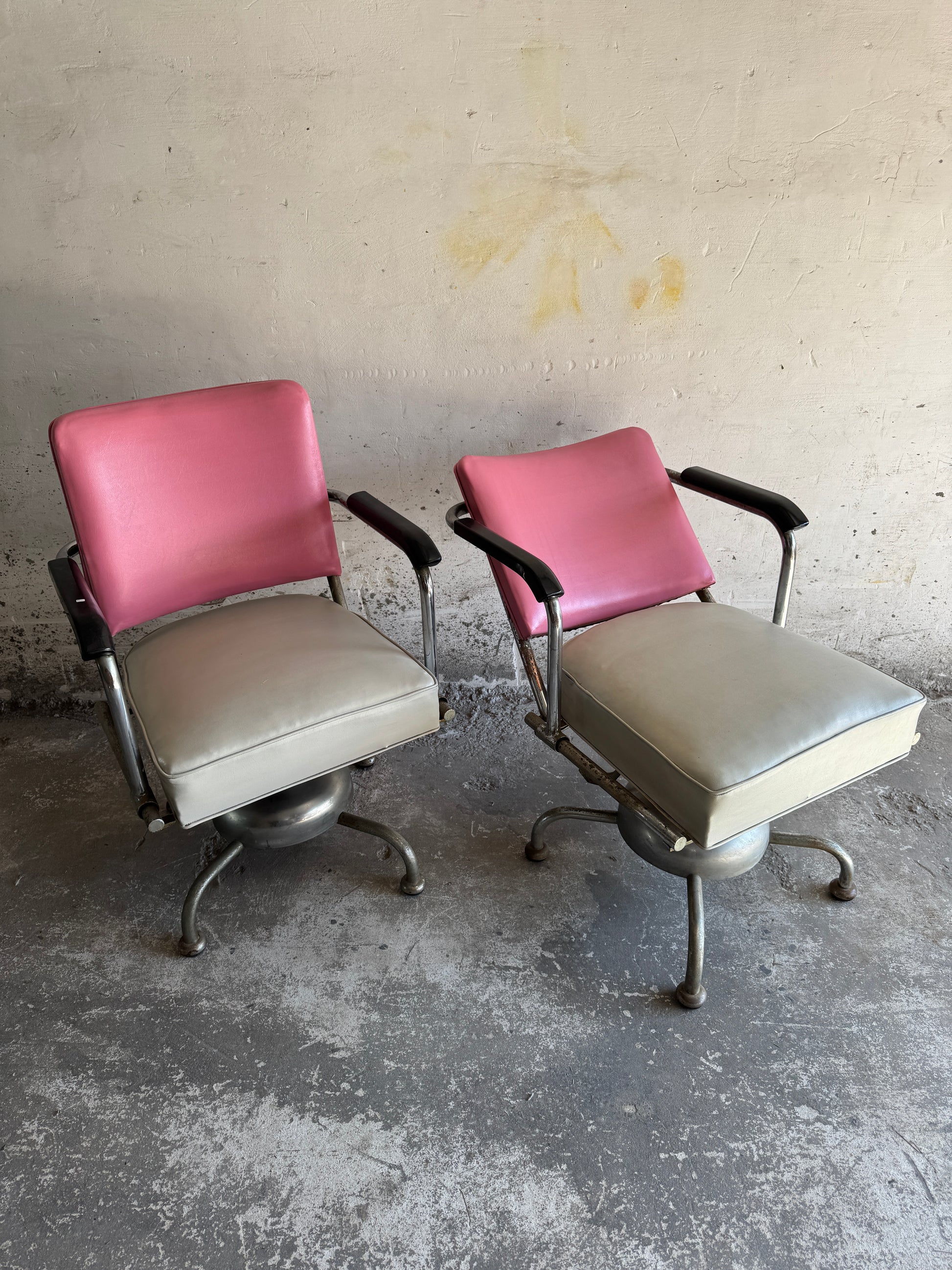 Set van twee vintage kappersstoelen in roze en zilver
