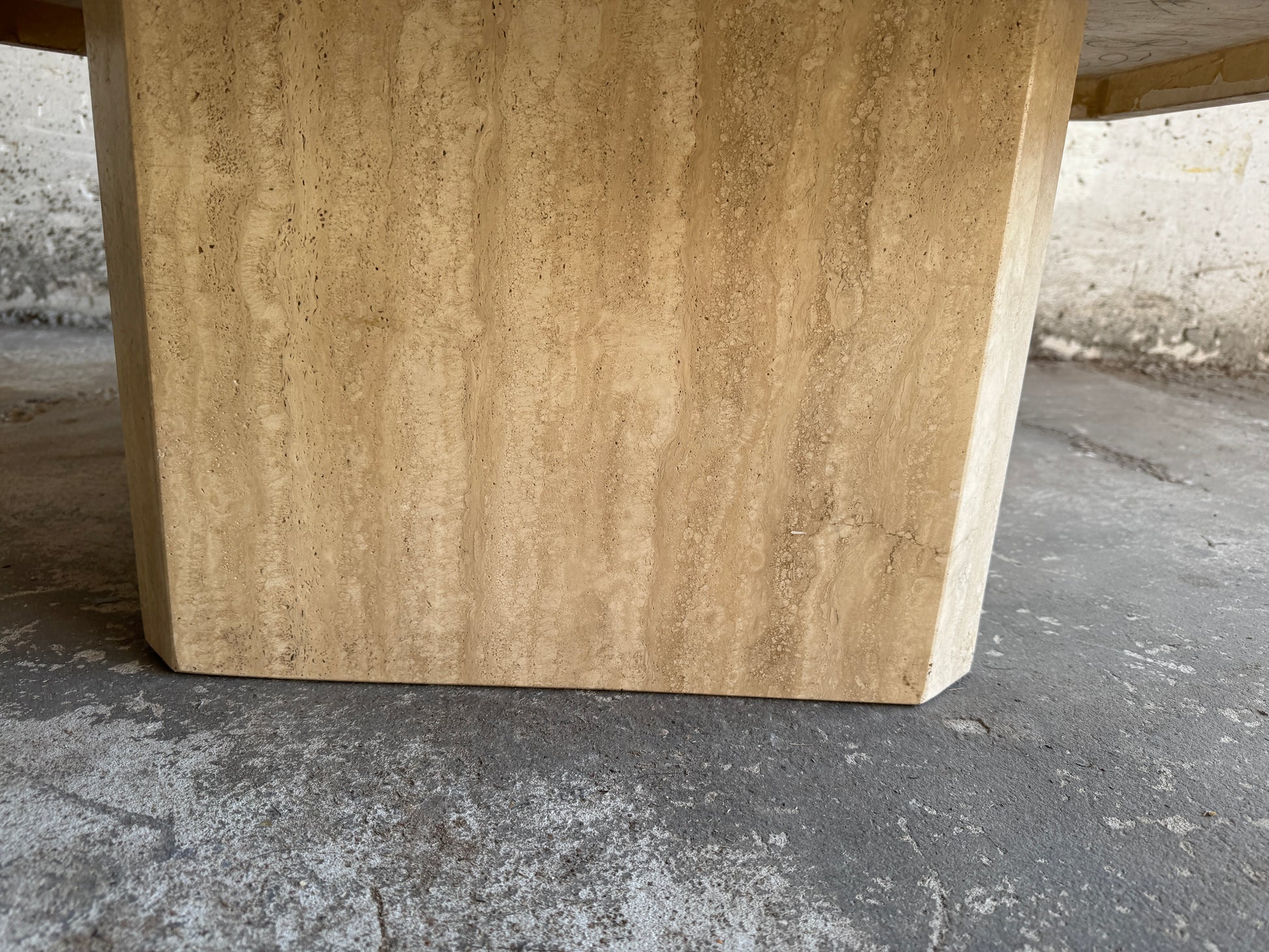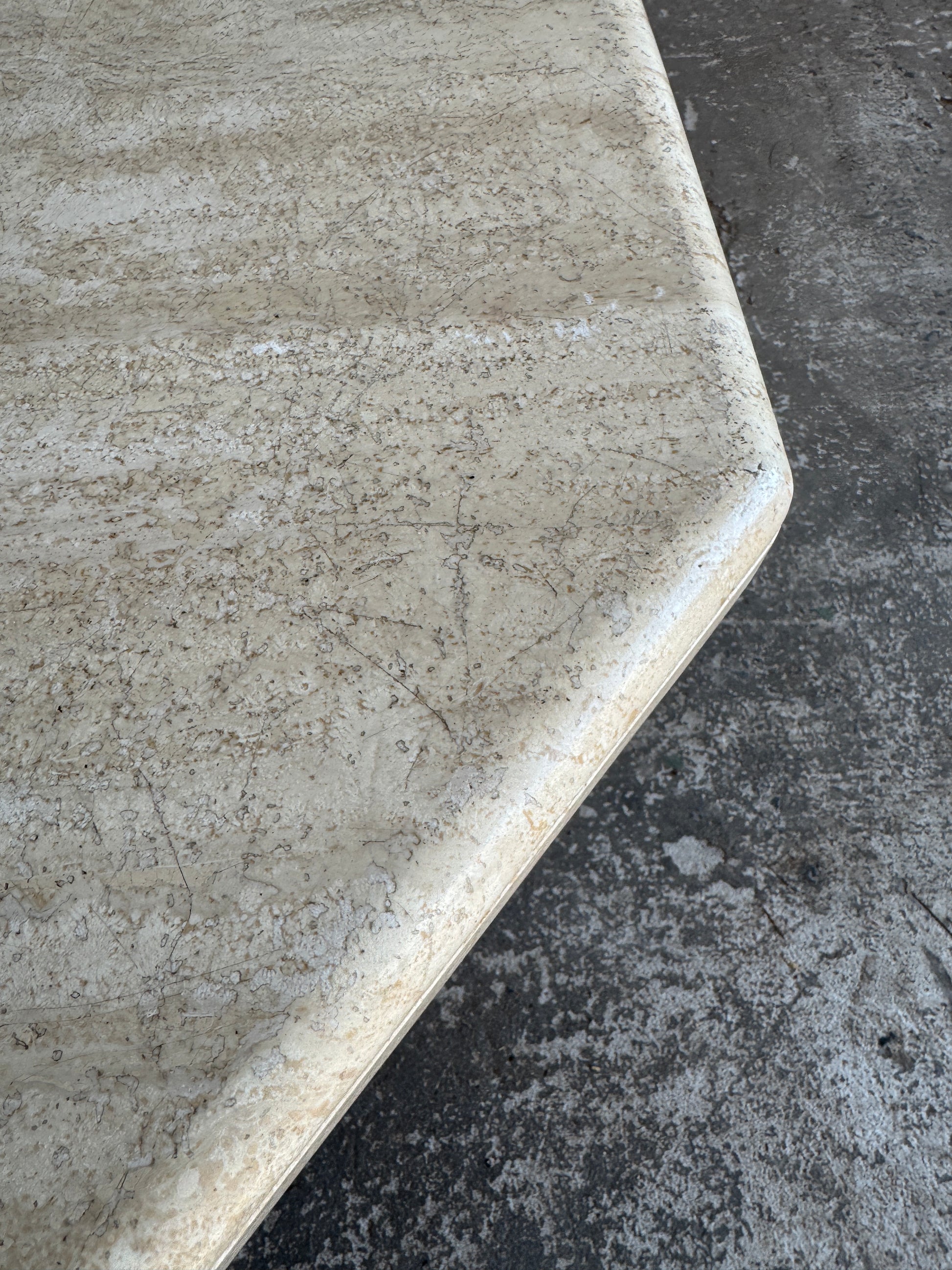 Deze uitzonderlijke travertijn salontafel is een sculpturaal en zwaar designstuk met een unieke zeshoekige vorm. Gemaakt van massief natuursteen, straalt deze tafel tijdloze elegantie en Italiaanse allure uit.