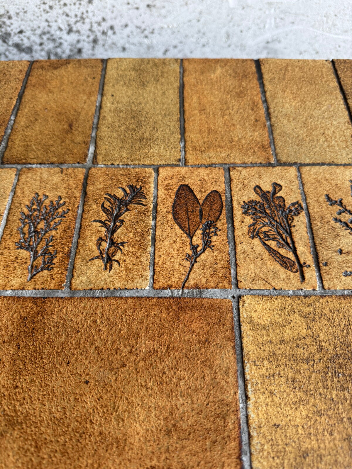 Stijl en functionaliteit De warme aardetinten en organische motieven geven deze tafel een rustieke, natuurlijke uitstraling. Het brutalistische ontwerp wordt verzacht door de zachte vormen en het ritmische bladpatroon. Ideaal als statement piece in een stijlvol interieur.