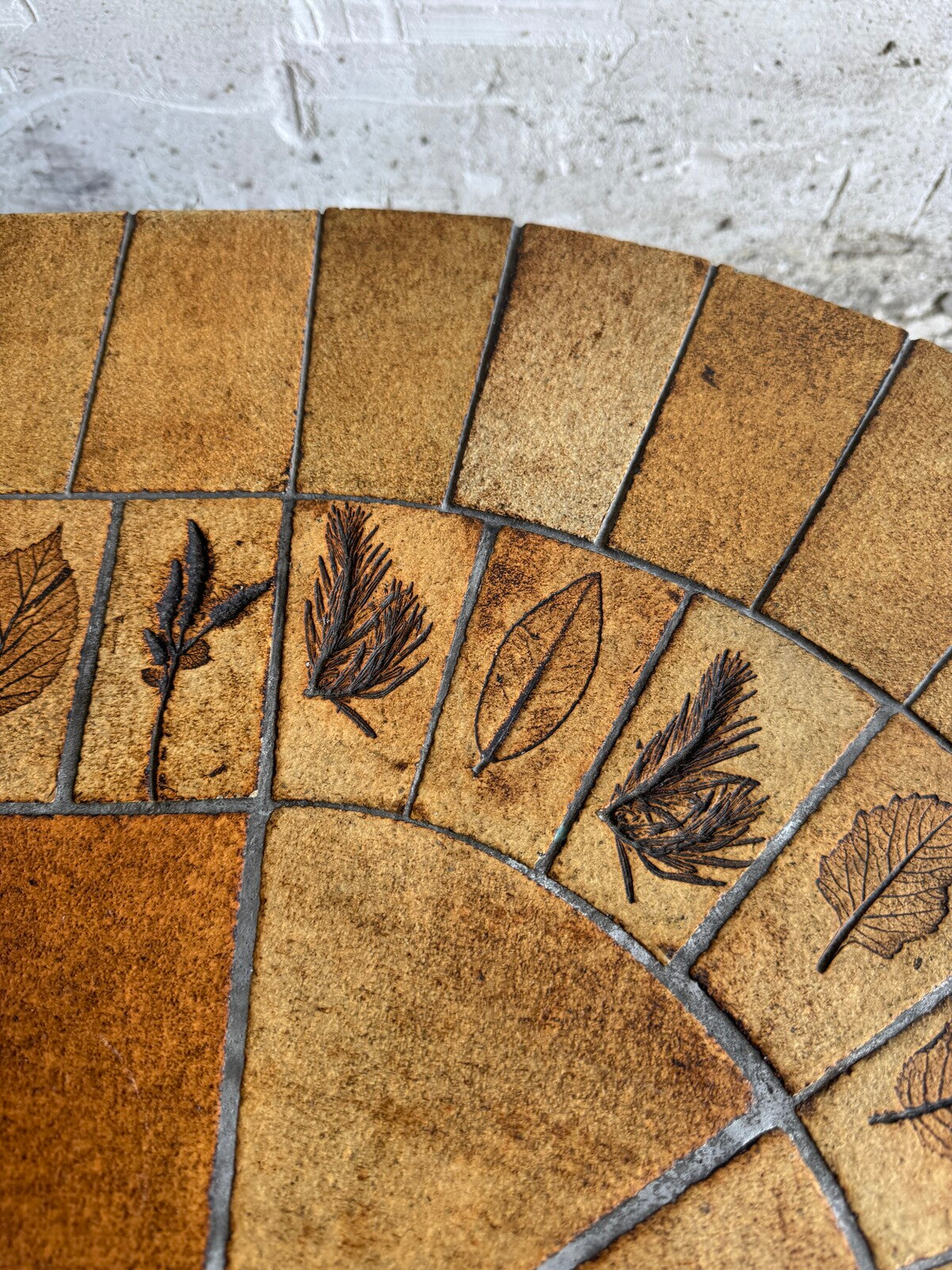 Zeldzame vintage salontafel van Roger Capron, de iconische Franse keramist uit Vallauris. Het ovale blad is ingelegd met keramische tegels met Caprons karakteristieke bladindrukken – een eerbetoon aan de natuur, gegoten in een tijdloos design.