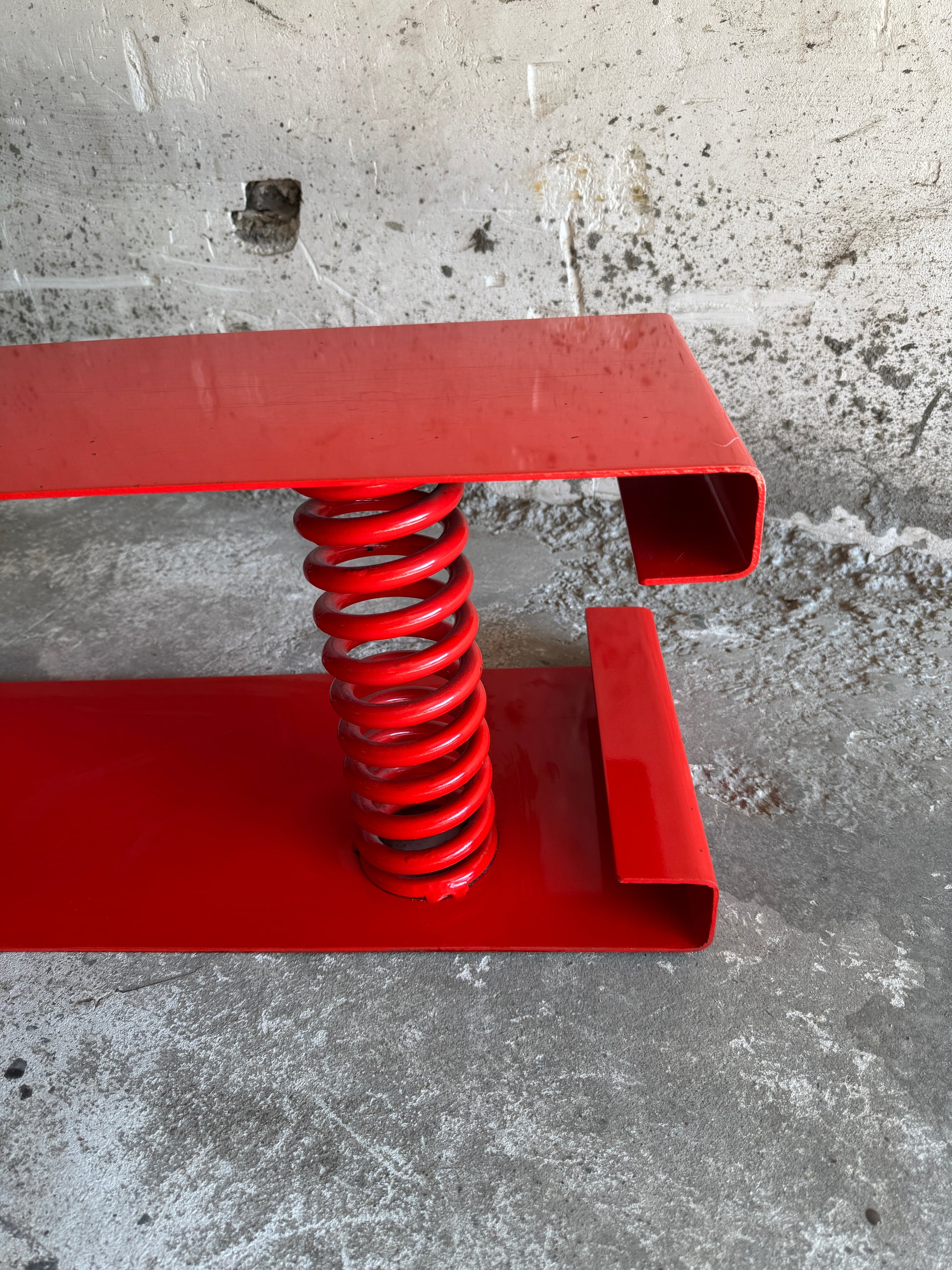 Stijl en functionaliteit De tafel is volledig uitgevoerd in felrood gelakt metaal en valt op door zijn robuuste industriële vorm en centrale veerstructuur die zowel esthetisch als constructief functioneert. Ideaal als lage salontafel of kunstobject.