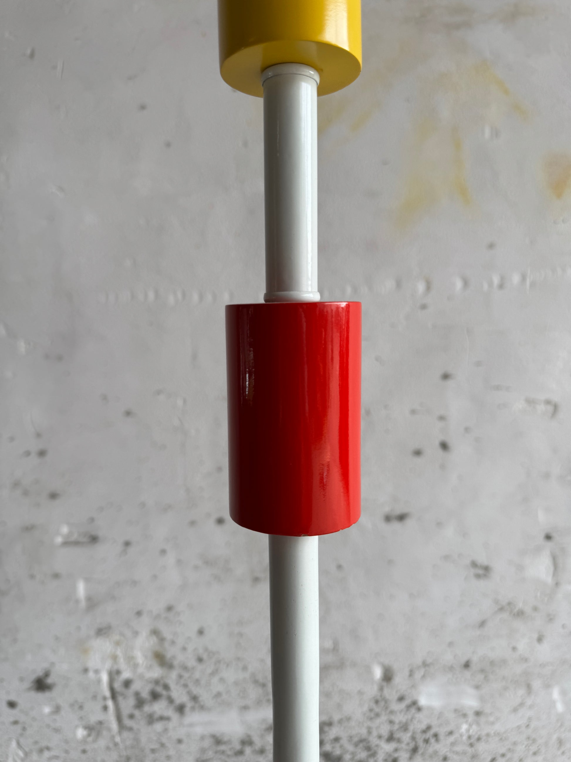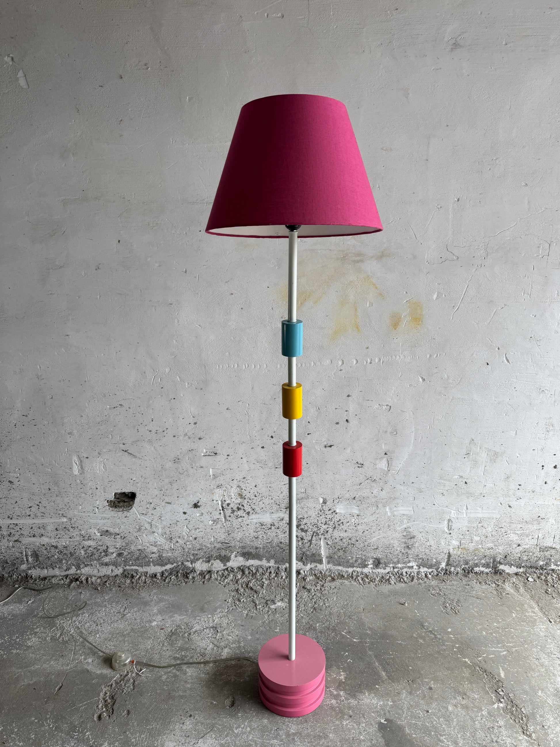 Vintage IKEA Memphis-stijl staande lamp met kleurrijke accenten Deze zeldzame IKEA staande lamp uit de jaren 80-90 is een speelse knipoog naar de Memphis-stijl, met zijn levendige kleurencombinatie en geometrische vormen. De lamp is opgebouwd uit een witte metalen standaard, een roze schijfvormige voet en accenten in blauw, rood en geel.