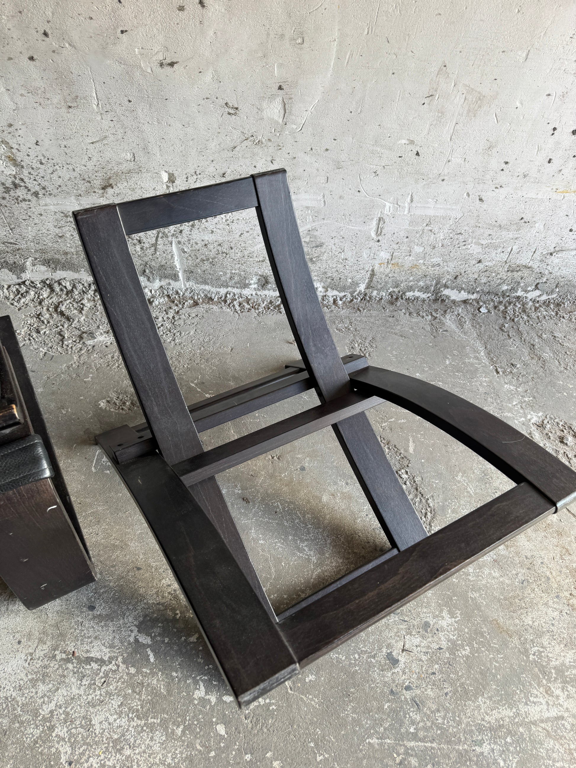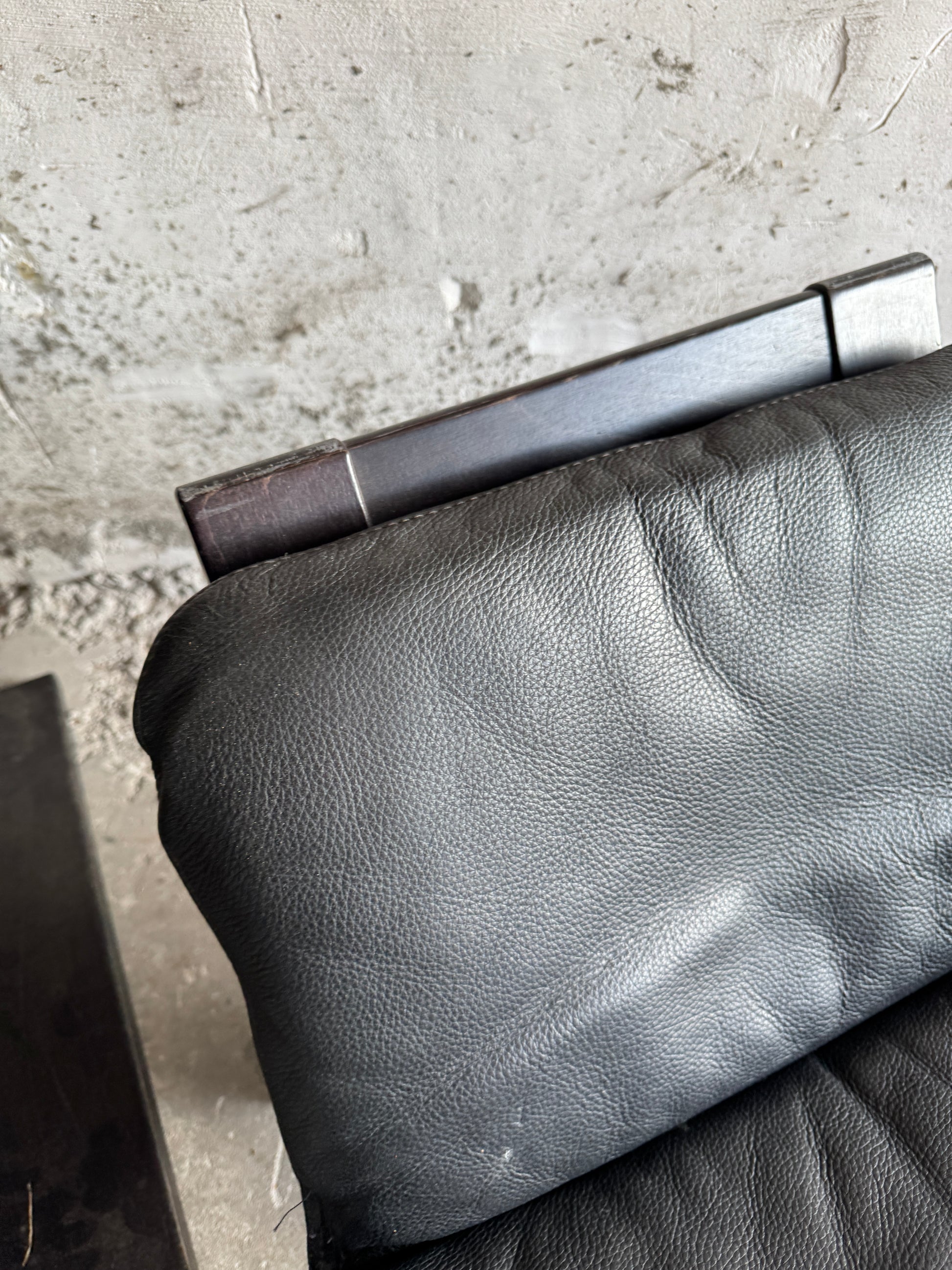 Vintage loungestoel met bijpassende voetenbank in zwart leer Deze karaktervolle loungestoel met bijpassende voetenbank straalt kracht en comfort uit. De diepe zitting, dikke leren kussens en het donkere houten frame geven deze set een robuuste uitstraling met een luxe afwerking.