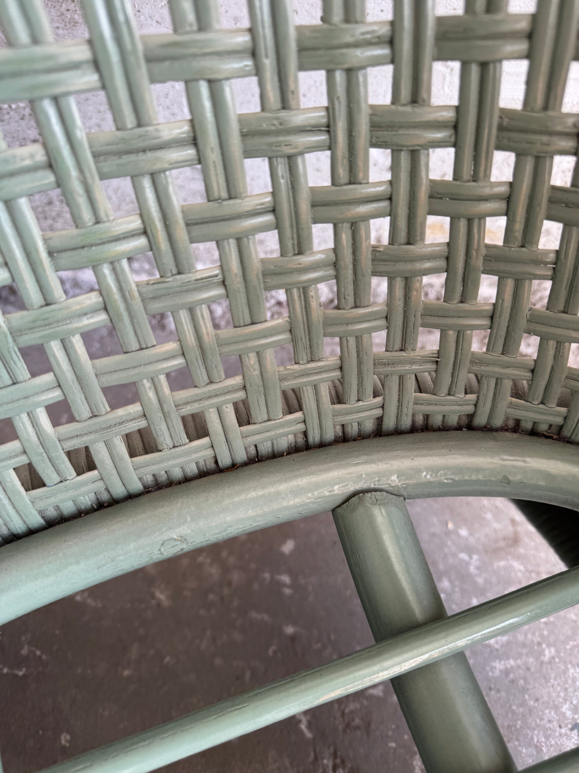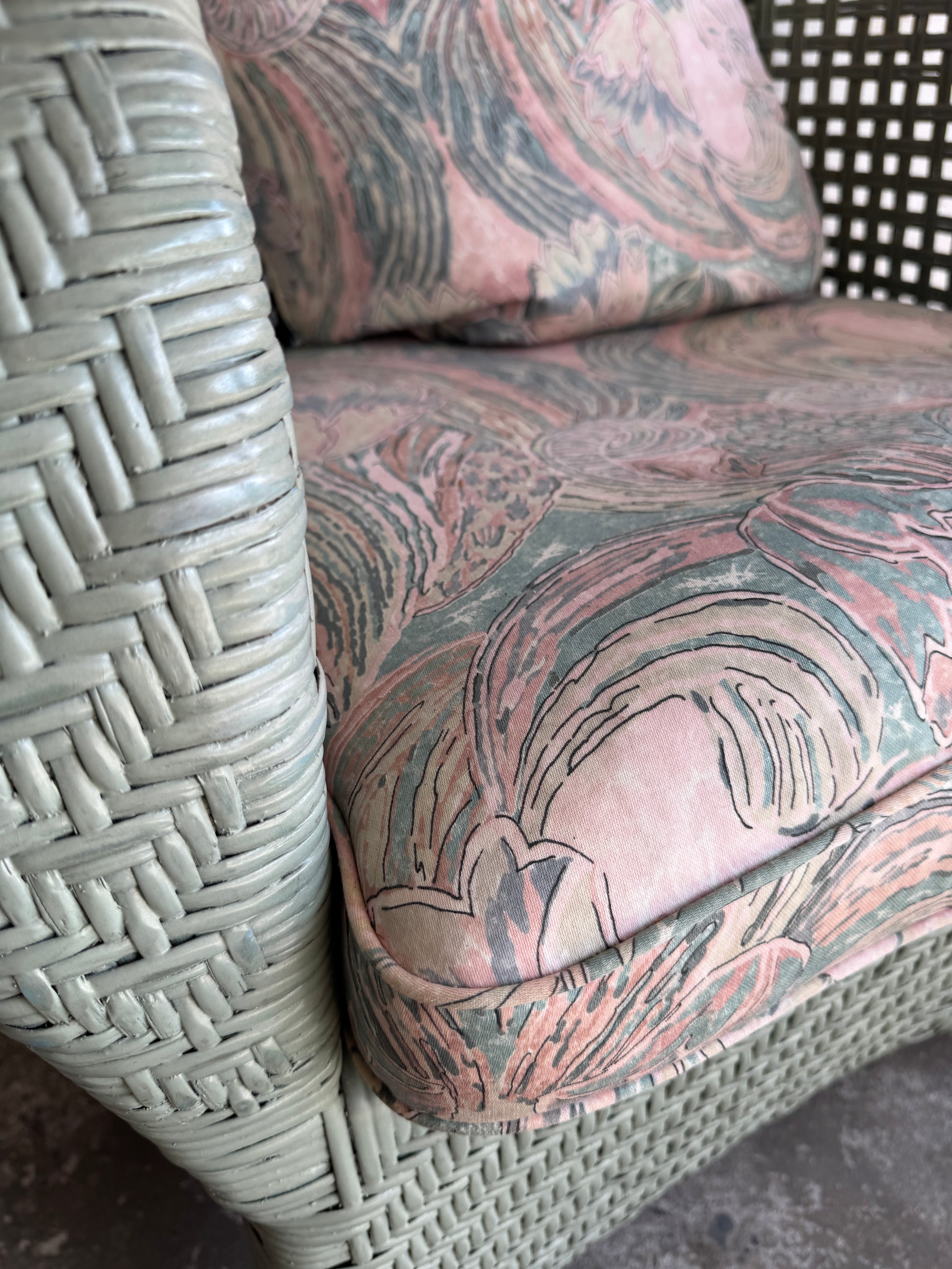 Comfort en kustcharme komen samen in deze vintage rieten loungestoel met afgeronde rugleuning en zachte rondingen. Gemaakt van licht saliegroen riet, met originele pastelkleurige kussens in een wervelend abstract patroon dat doet denken aan de jaren 80.