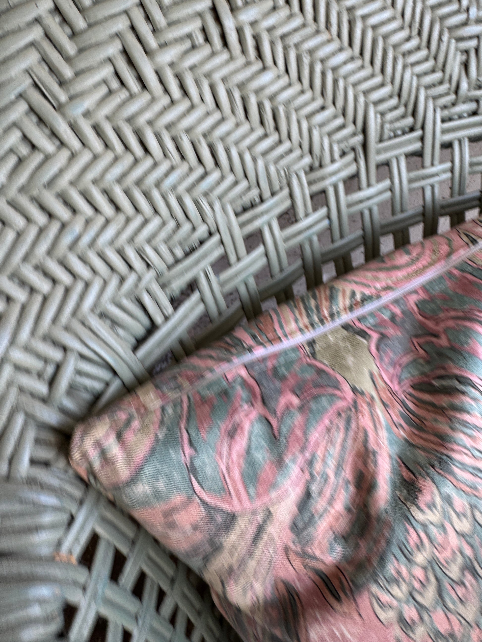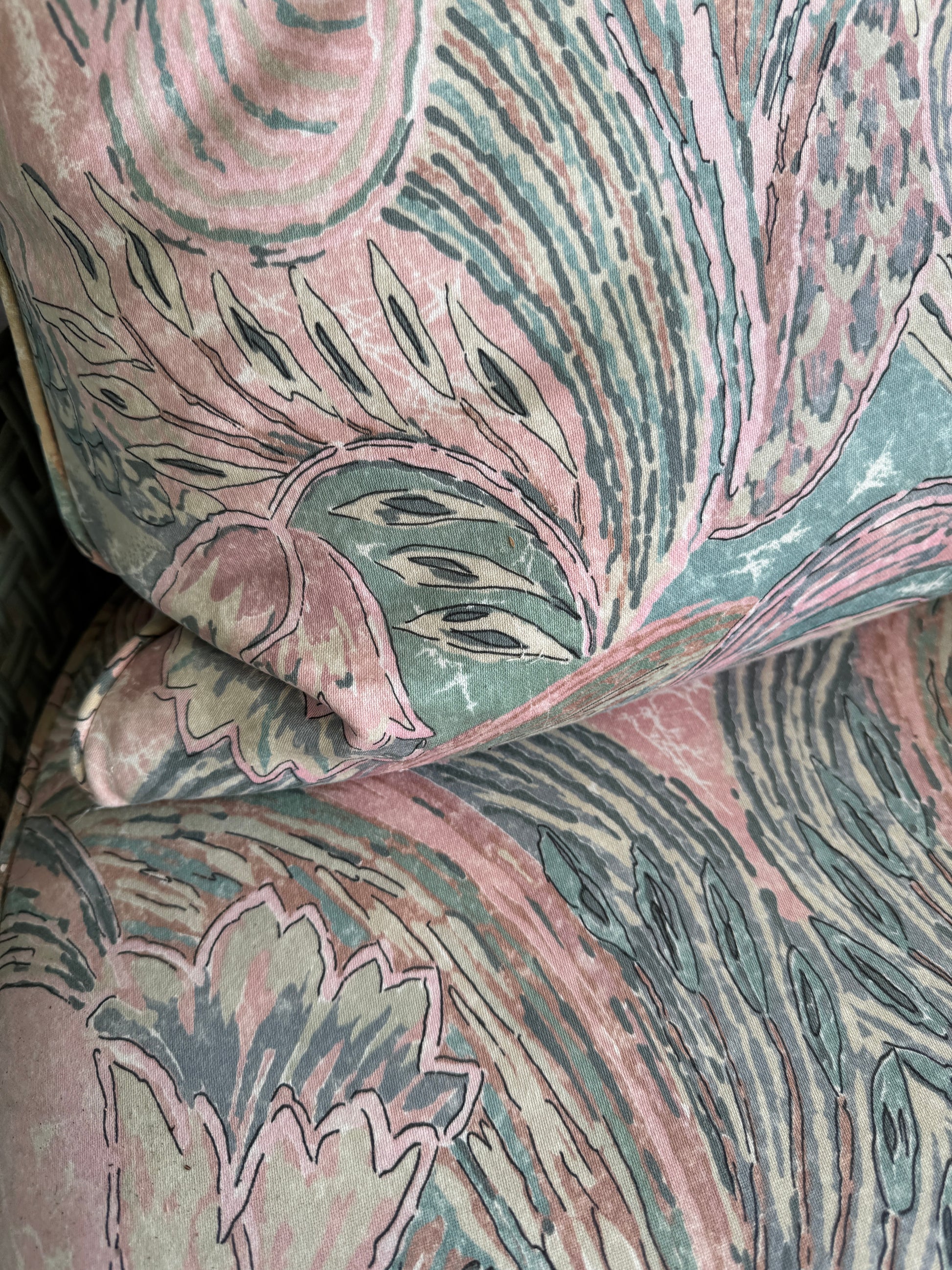 Vintage rieten loungestoel met pastelkleurige kussens – jaren 80