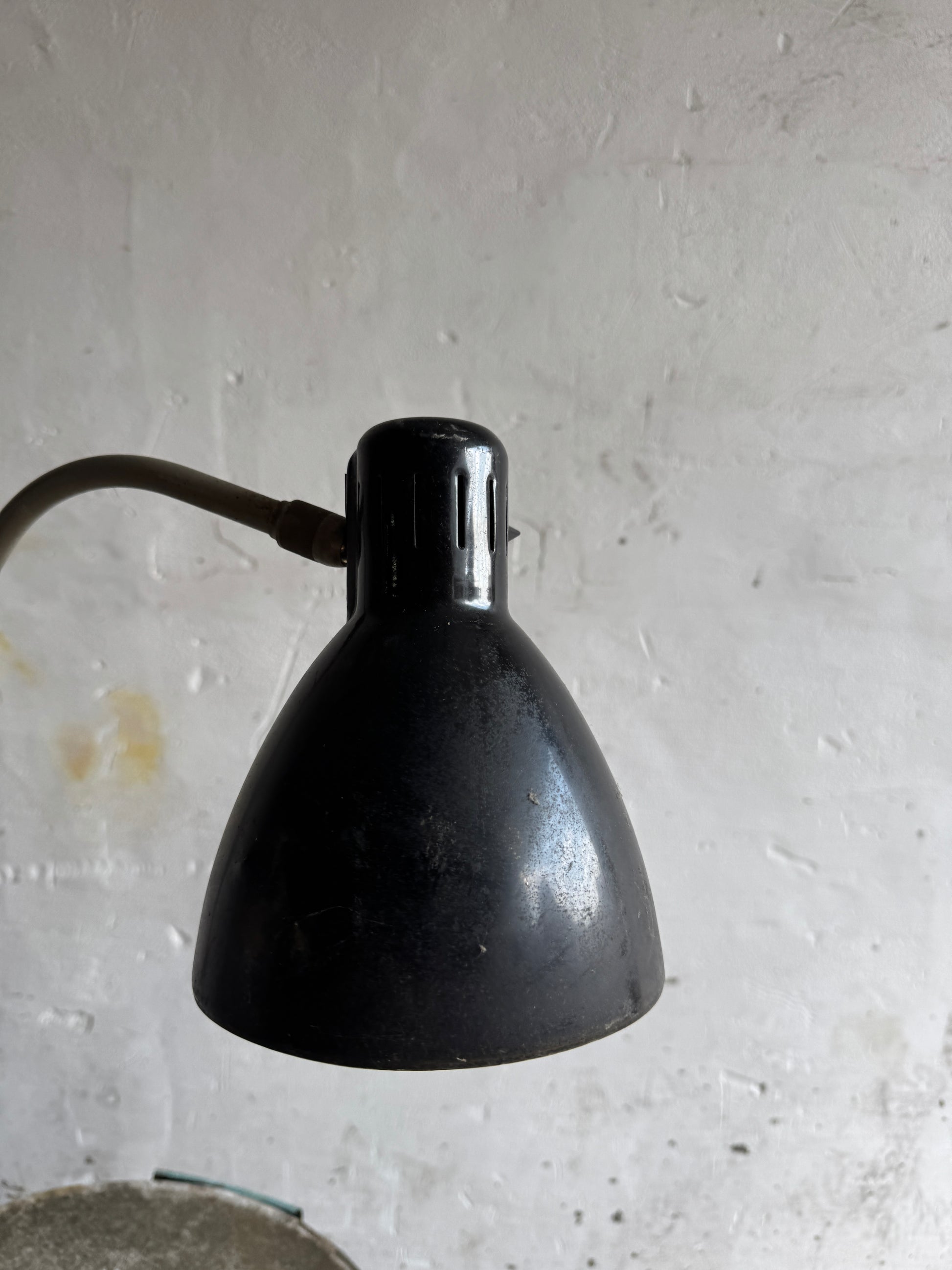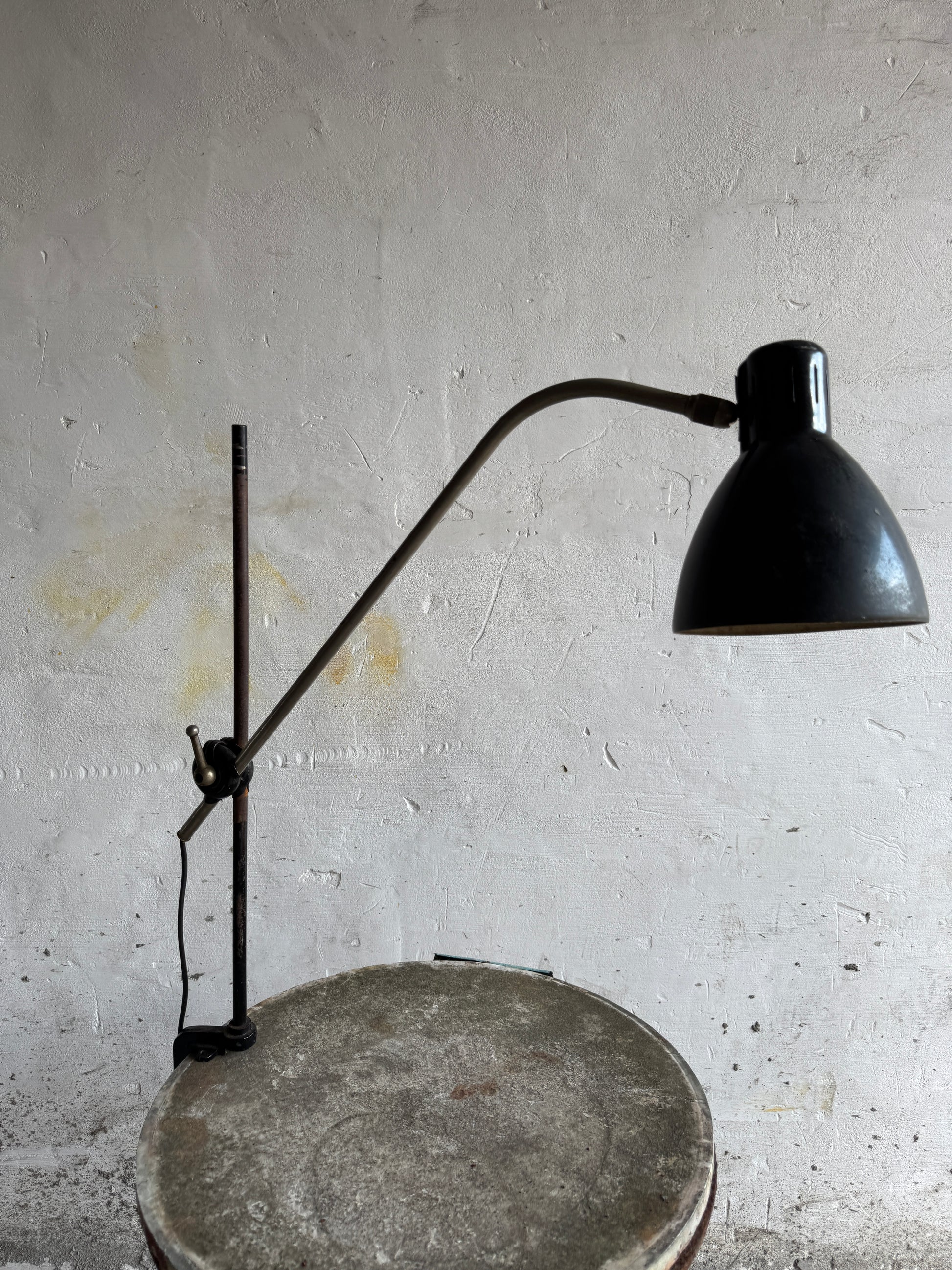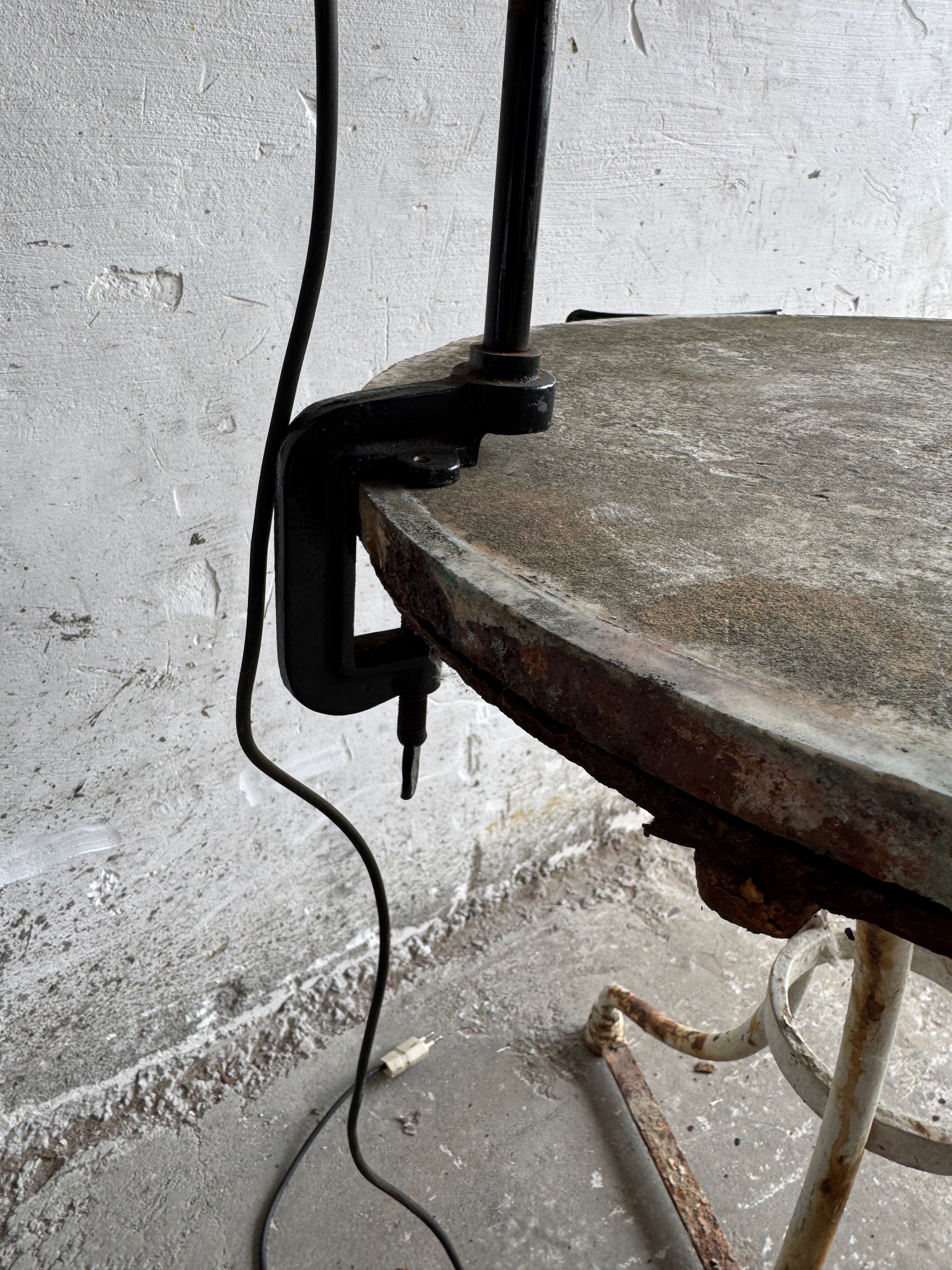 Deze zeldzame vintage industriële lamp met schroefbevestiging heeft een strakke zwarte metalen kap en een elegant gebogen arm die aan een verticale stang is bevestigd. De lamp is ontworpen om aan de rand van een tafel of werkblad te worden geklemd en is zowel ruimtebesparend als zeer functioneel. Het utilitaire ontwerp wordt verzacht door de vloeiende lijnen en warme patina, wat een tijdloze industriële esthetiek oproept.