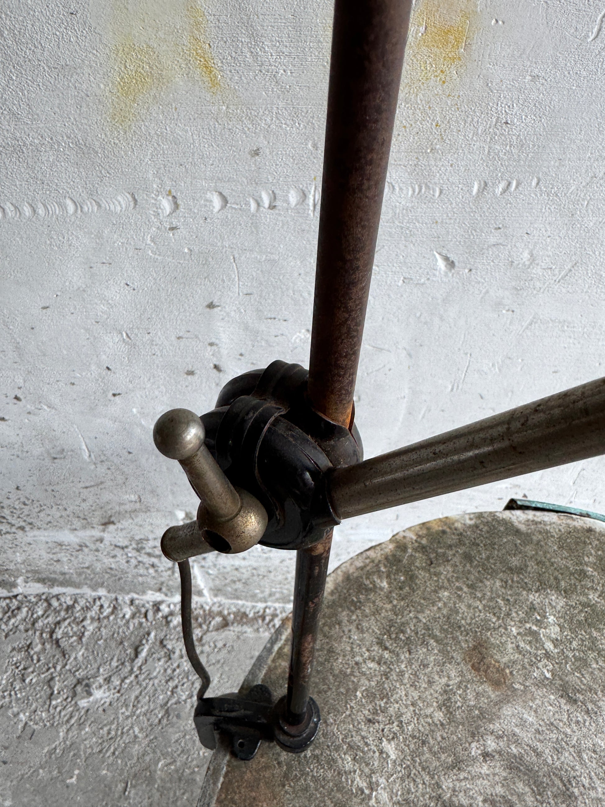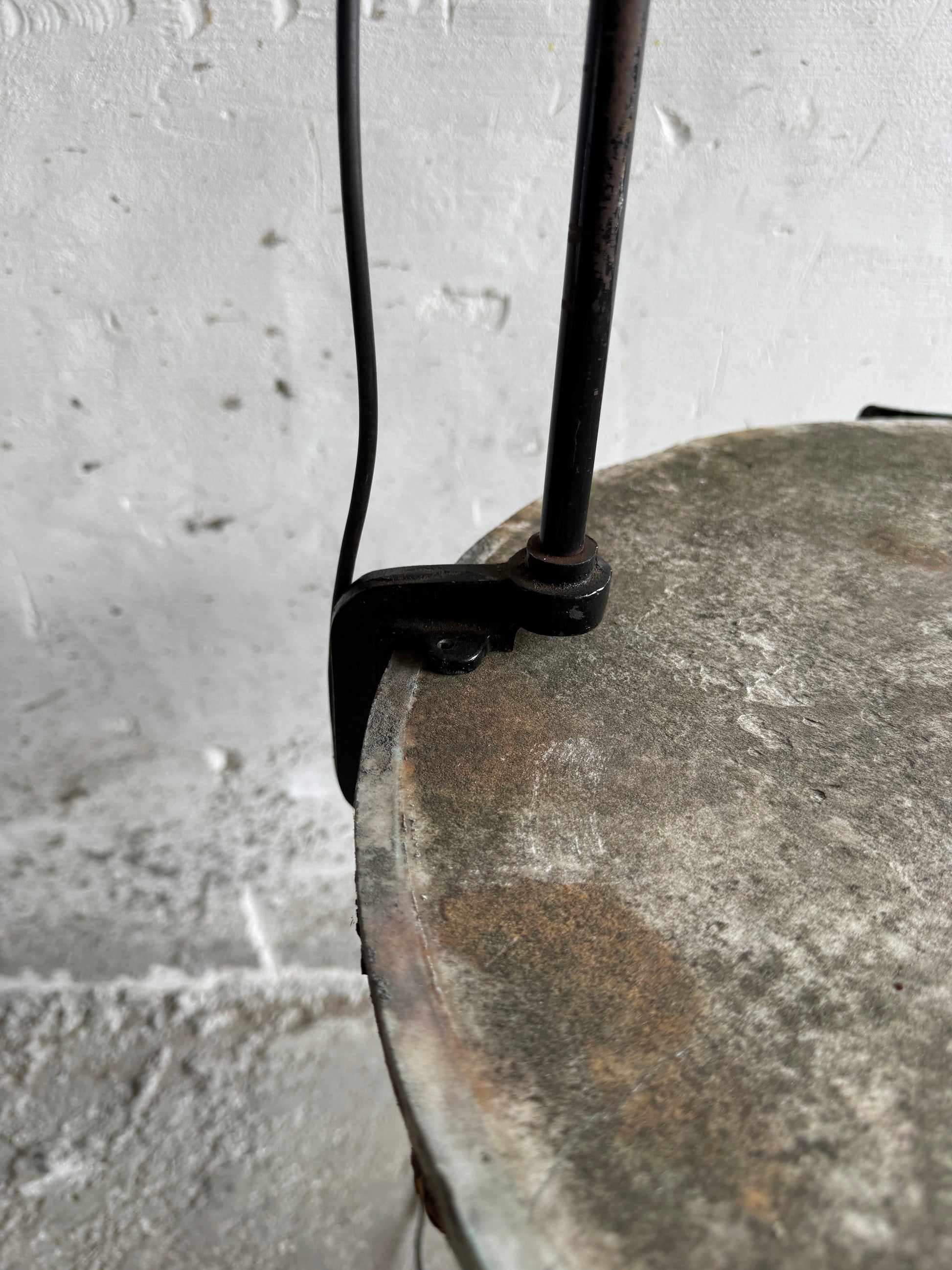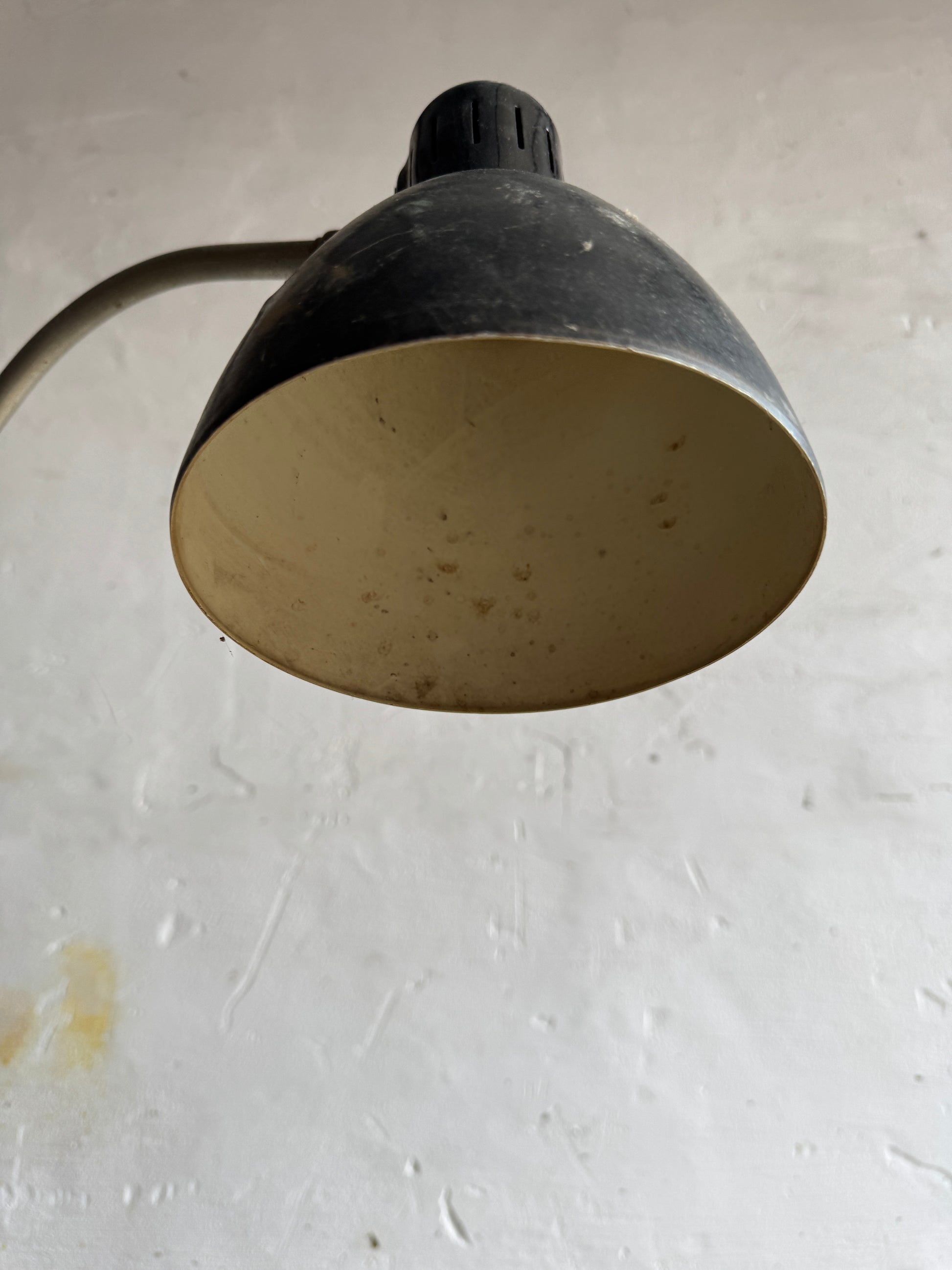 Deze zeldzame vintage industriële lamp met schroefbevestiging heeft een strakke zwarte metalen kap en een elegant gebogen arm die aan een verticale stang is bevestigd. De lamp is ontworpen om aan de rand van een tafel of werkblad te worden geklemd en is zowel ruimtebesparend als zeer functioneel. Het utilitaire ontwerp wordt verzacht door de vloeiende lijnen en warme patina, wat een tijdloze industriële esthetiek oproept.