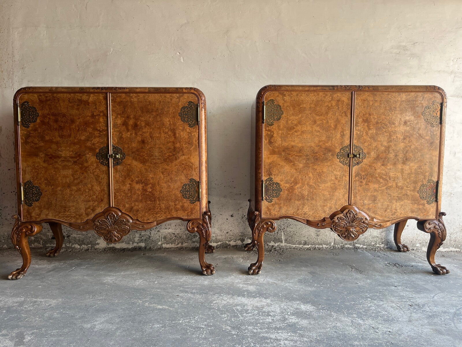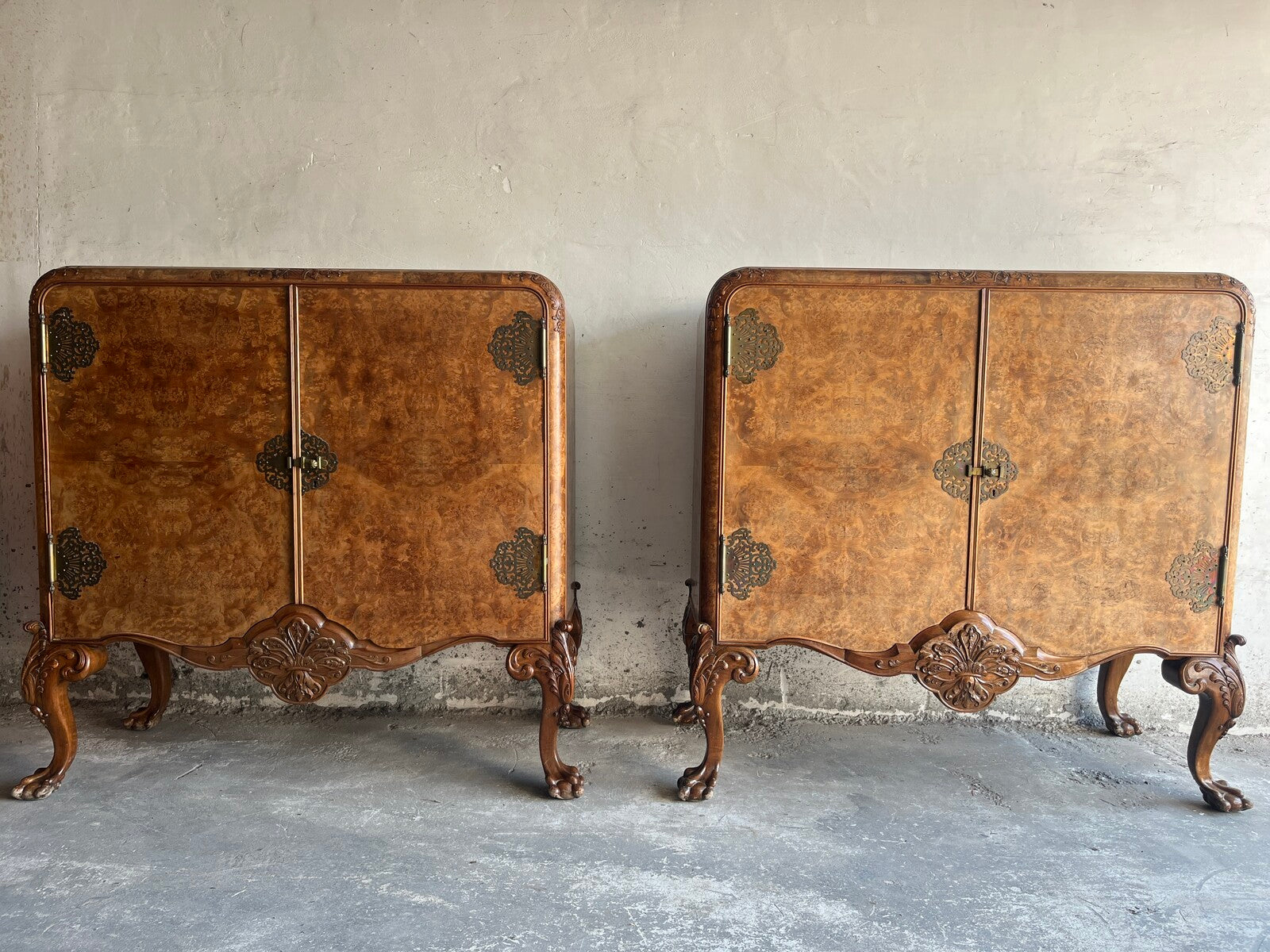 Dit prachtige paar vintage kasten is voorzien van prachtig wortelnotenhoutfineer en ingewikkelde, gebeeldhouwde accenten. Met elegant messing beslag en bloemensnijwerk staan deze kasten op cabriolepoten met klauwpoten, wat elke kamer een verfijnde touch geeft. Perfect voor opbergen of tentoonstellen, ze bieden zowel stijl als functionaliteit.
