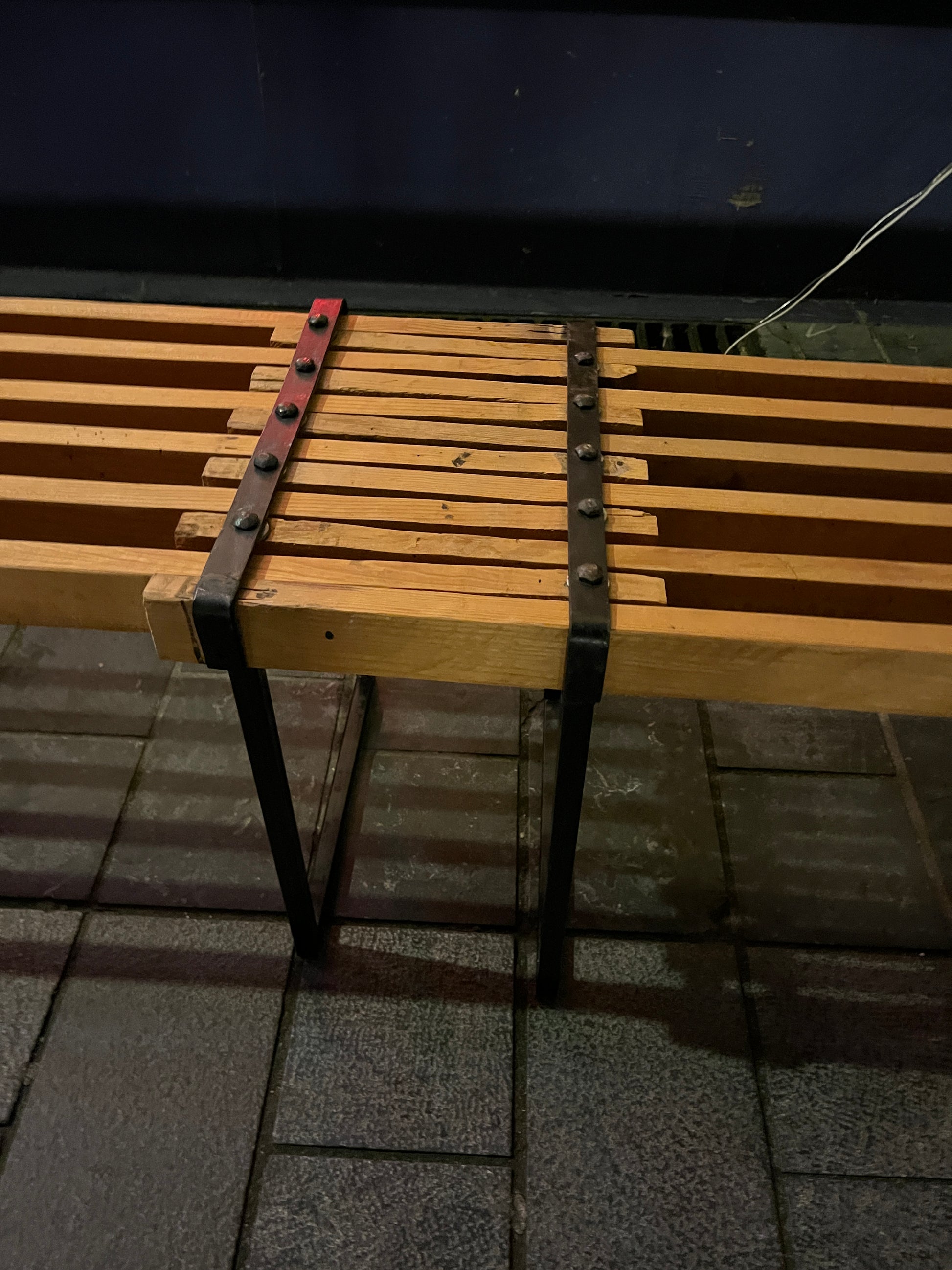 This expandable wooden bench combines solid craftsmanship with a strong industrial character. Designed with slatted wood and a black metal frame, it offers both visual rhythm and practical flexibility, making it a distinctive piece for indoor or sheltered outdoor use.
