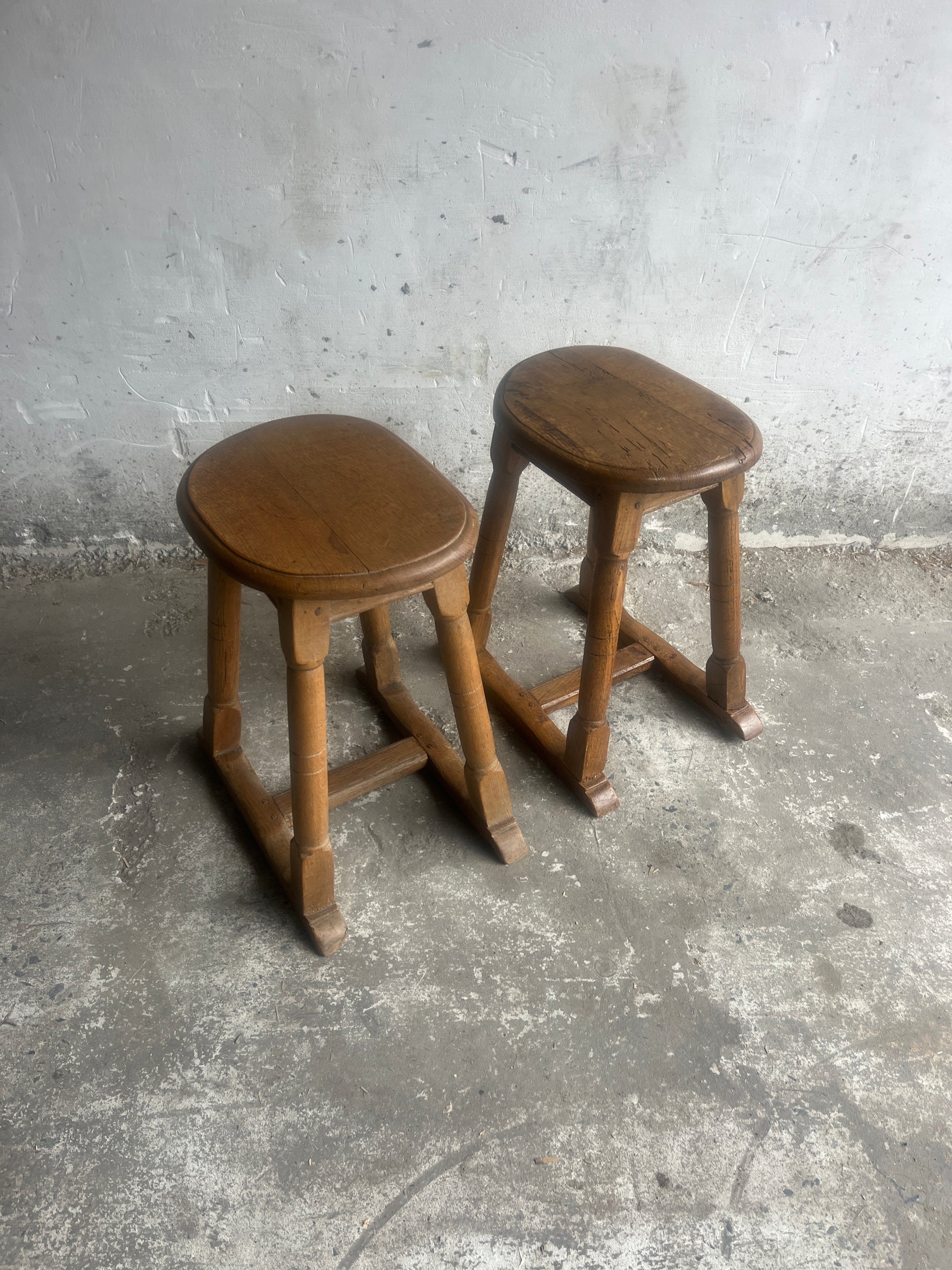 The stools have a natural, aged oak finish with softly rounded edges and solid cross-braced legs for stability. Perfect as small seating, bedside tables, or as sculptural objects beside a sofa or console. Their simplicity and authenticity make them ideal for rustic, wabi-sabi, or country interiors.