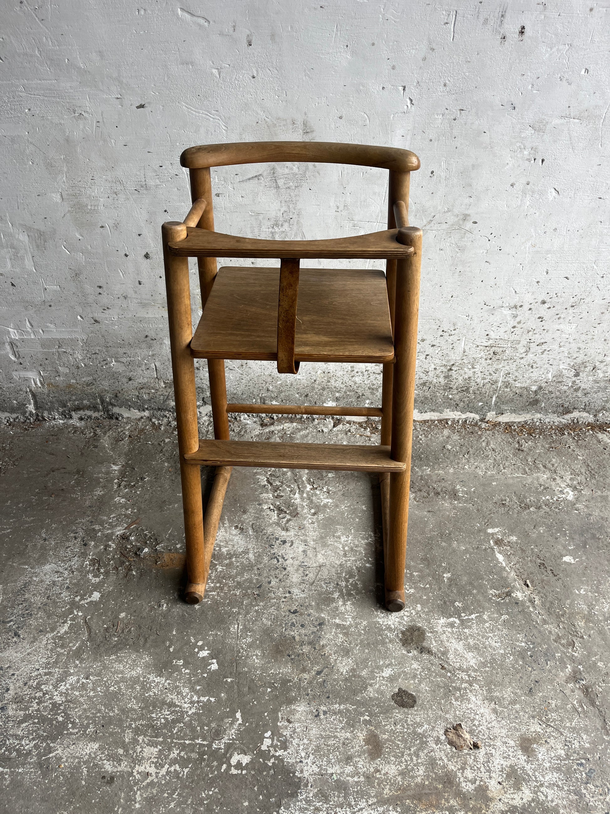 The chair features softly rounded lines, a sculptural curved backrest, and sturdy arm supports, offering excellent stability and comfort for a child. Its solid oak construction and warm natural patina give it a timeless presence, making it equally suitable as a functional children’s chair or a decorative accent in a Scandinavian or mid-century interior.