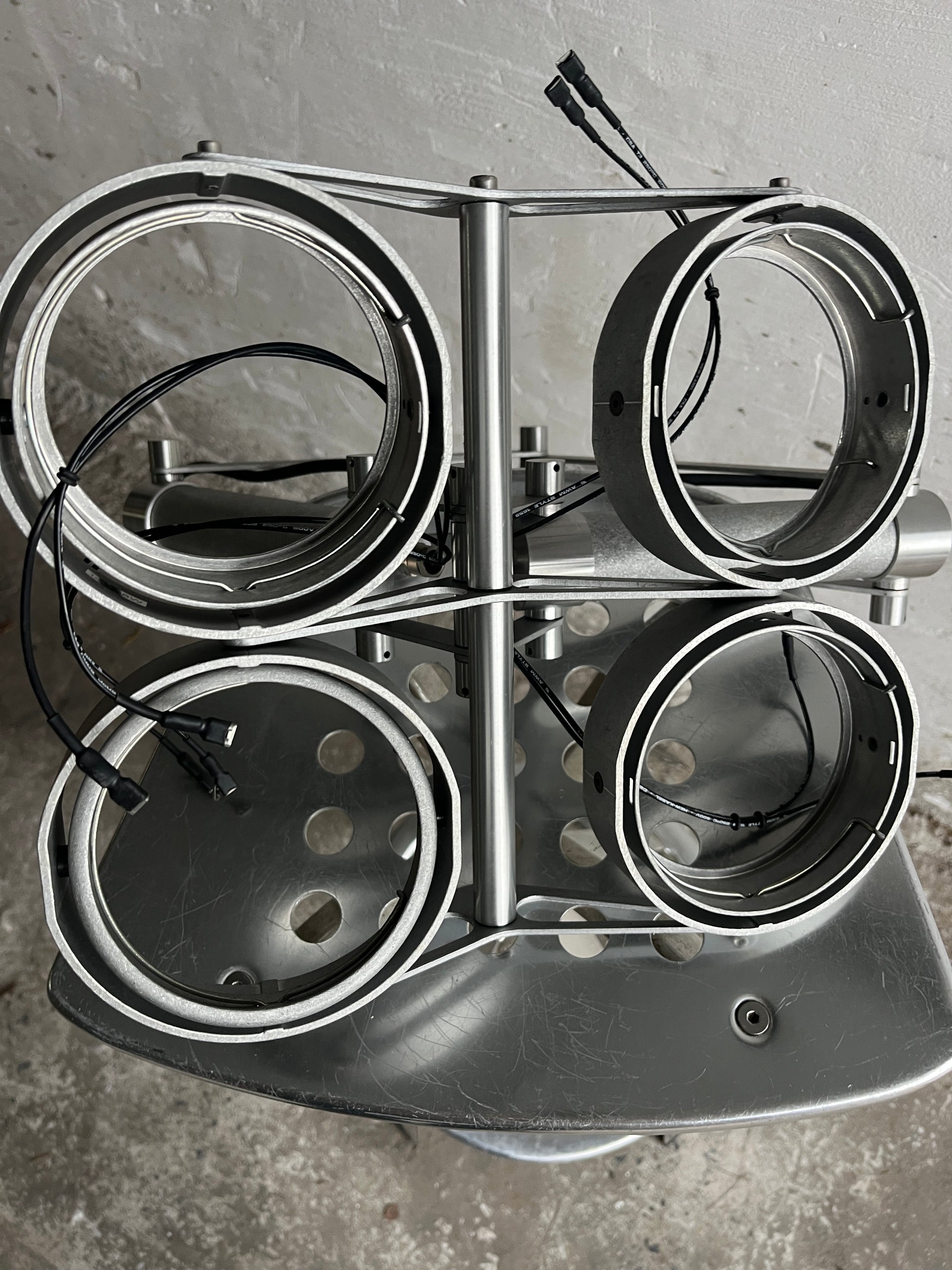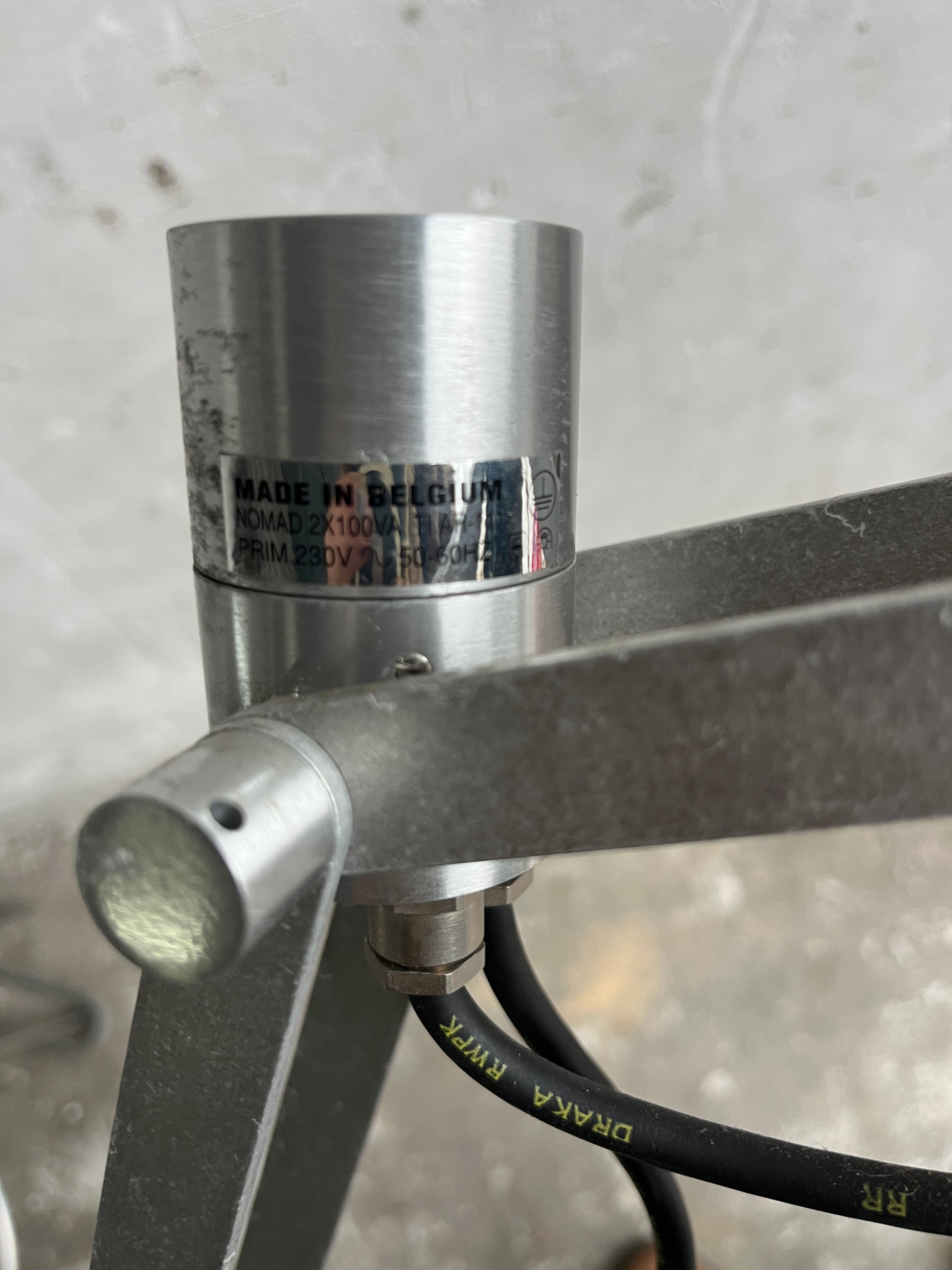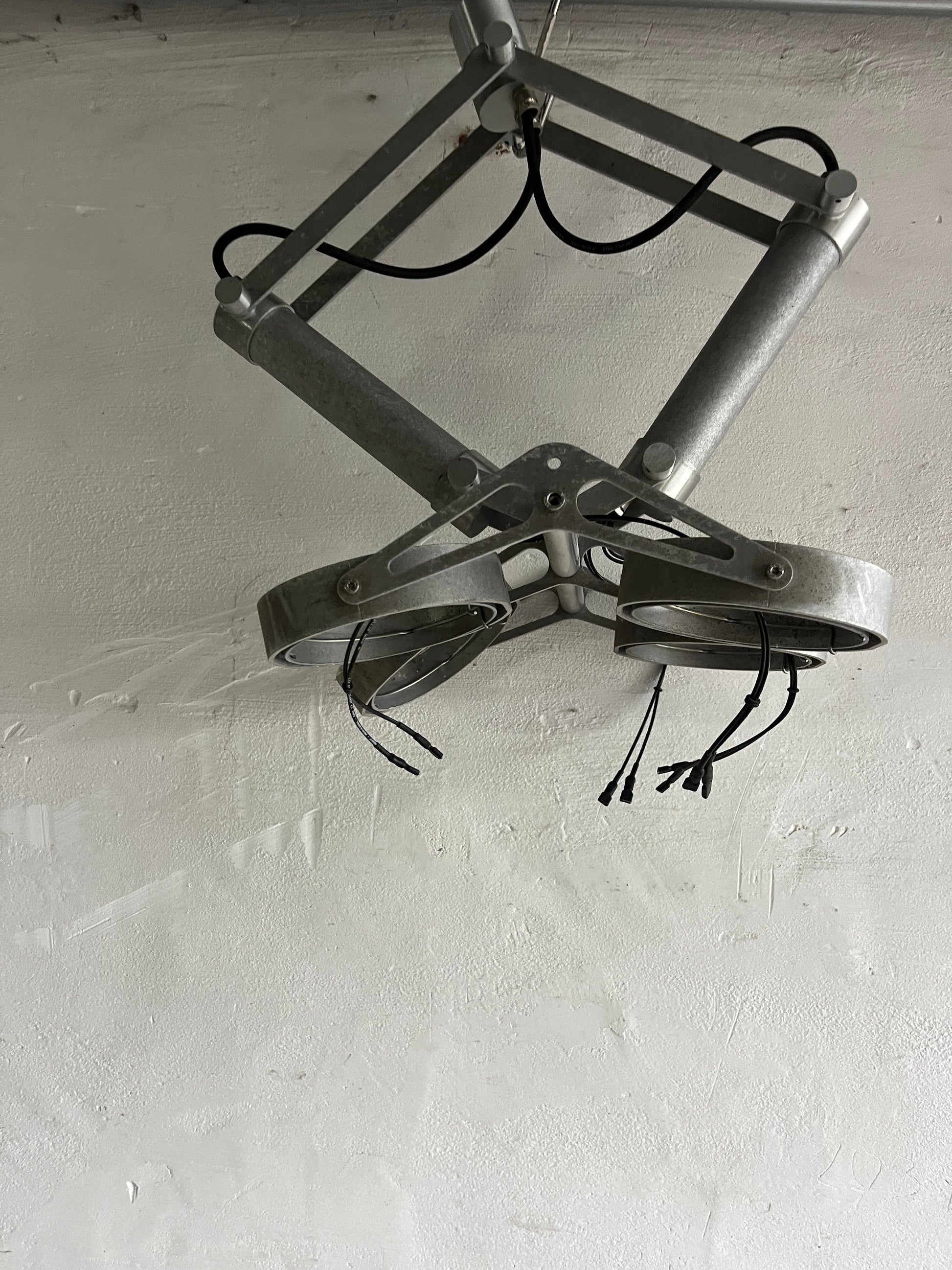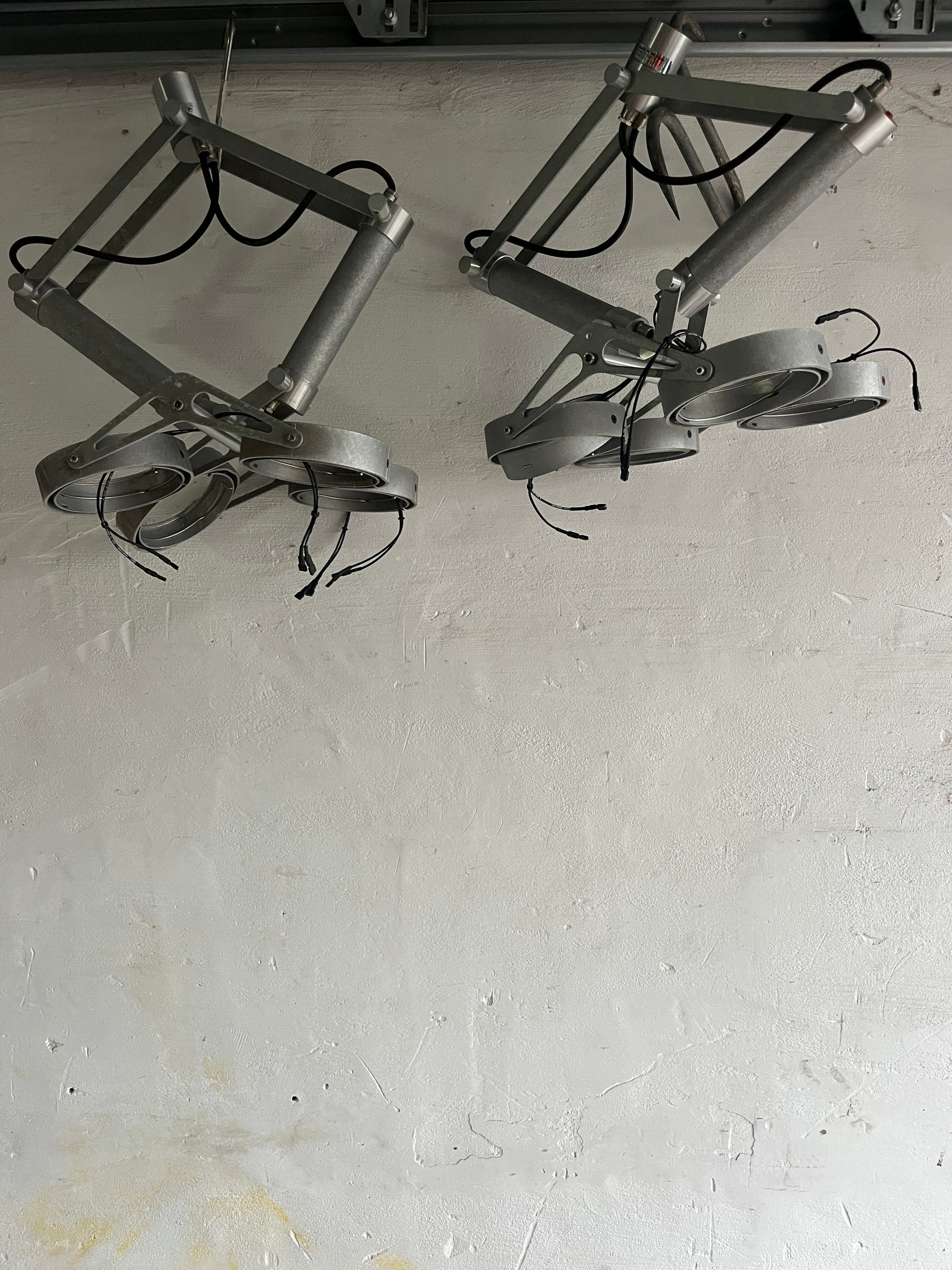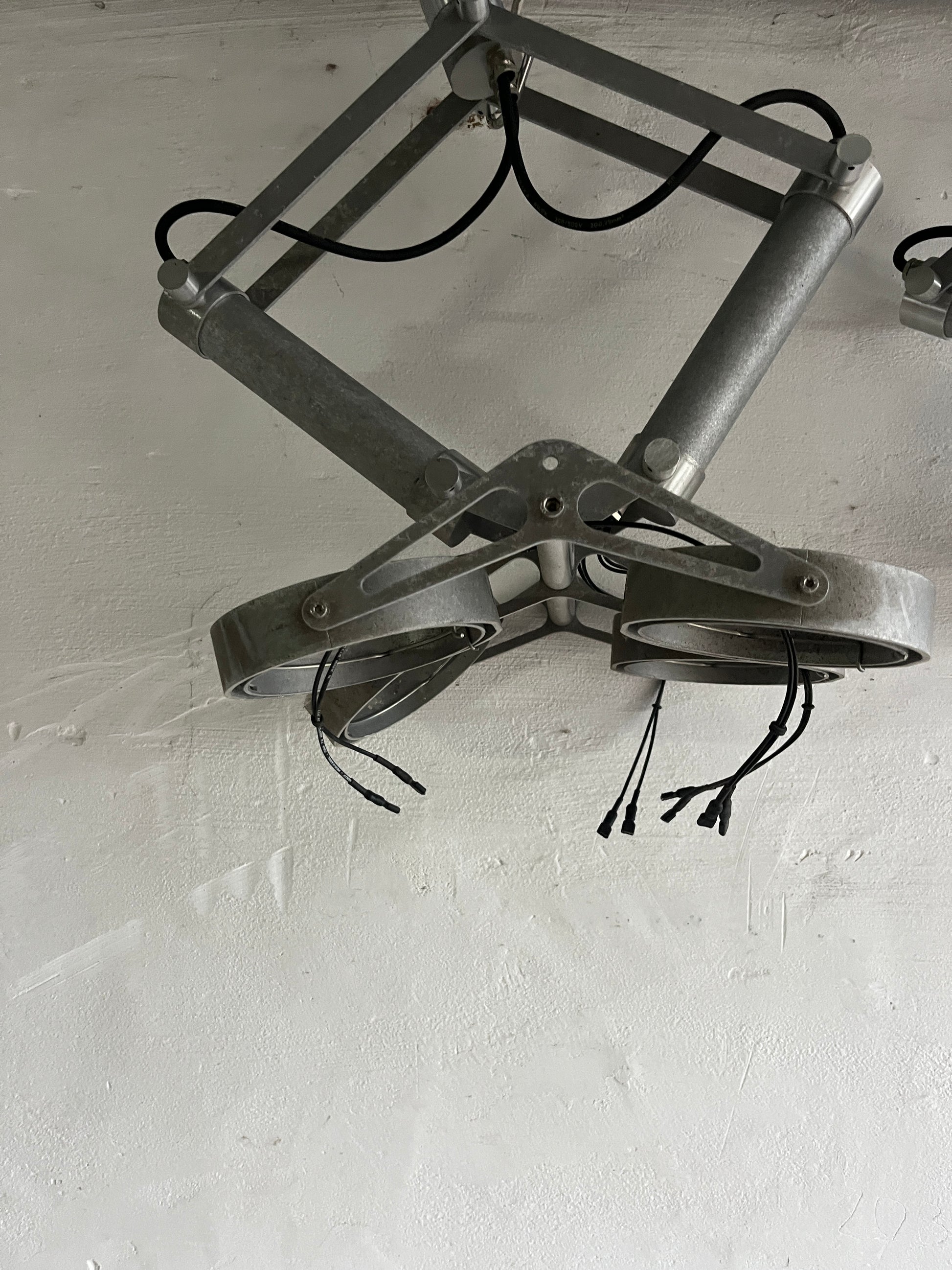 The articulated aluminium arms allow precise positioning of the light heads, making this fixture both visually striking and functionally versatile. Its raw, industrial finish and exposed mechanics give it a strong architectural character, ideal for lofts, galleries, retail spaces, or contemporary homes.
