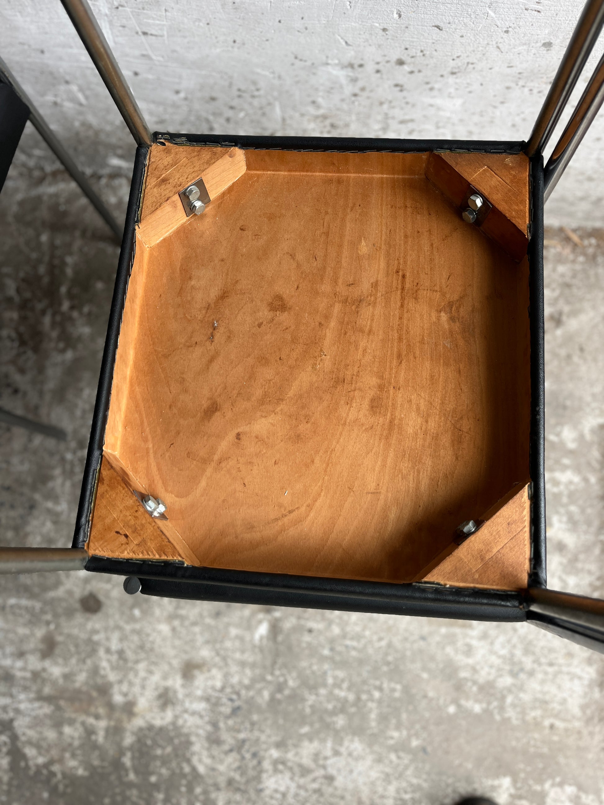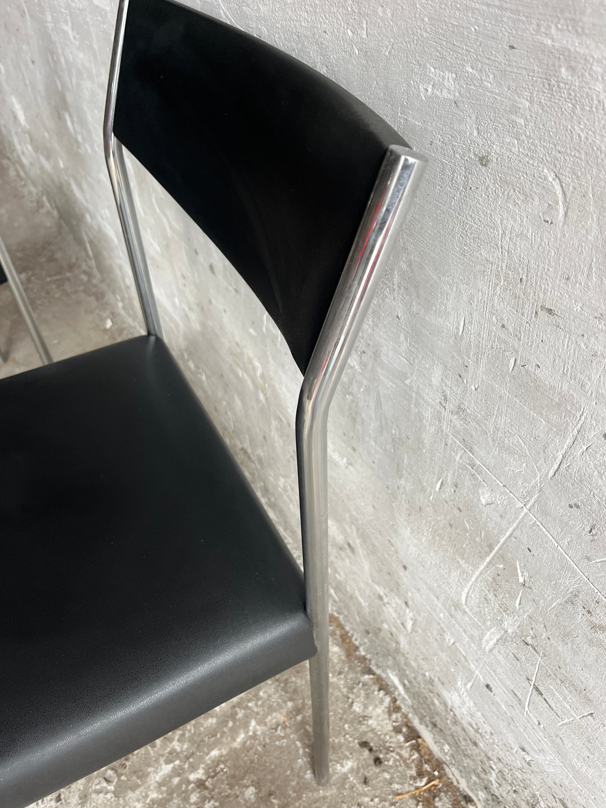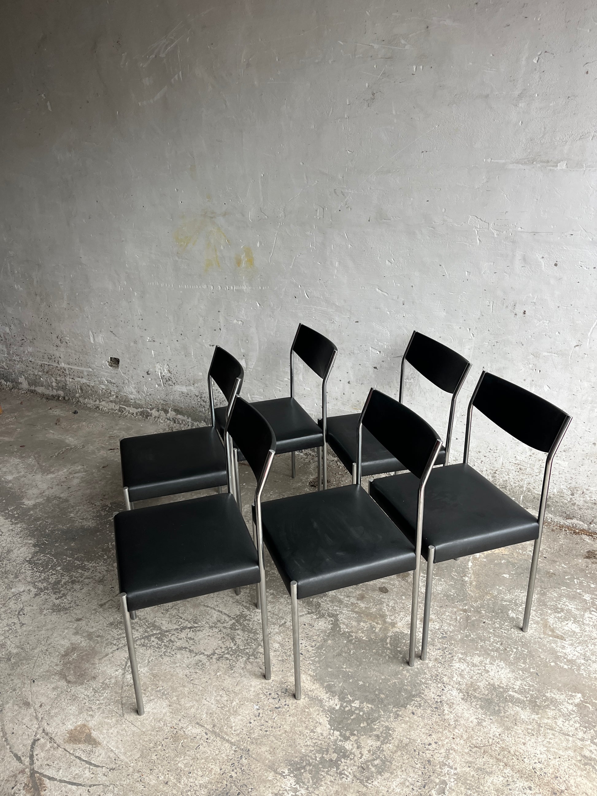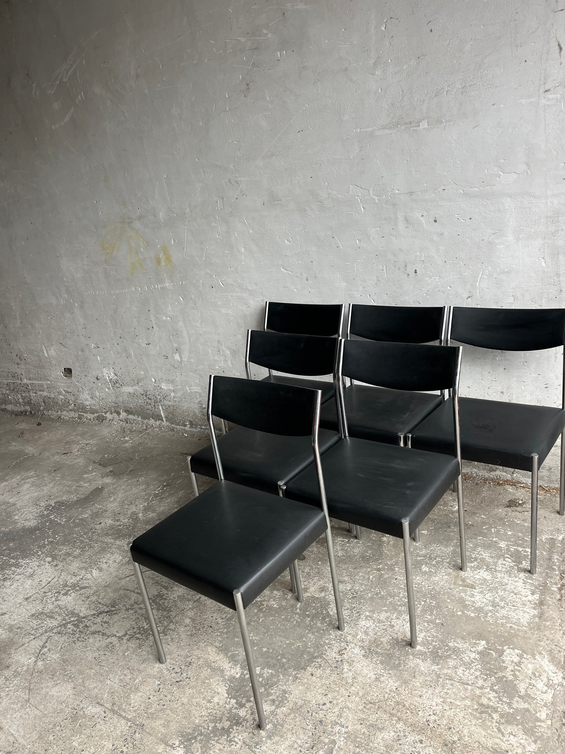 Elegant set of six mid-century dining chairs dating from the 1950s. These chairs feature black upholstered seats and backrests combined with slender chrome-plated metal frames, reflecting the clean, functional aesthetics of post-war European design.